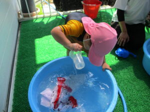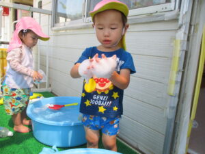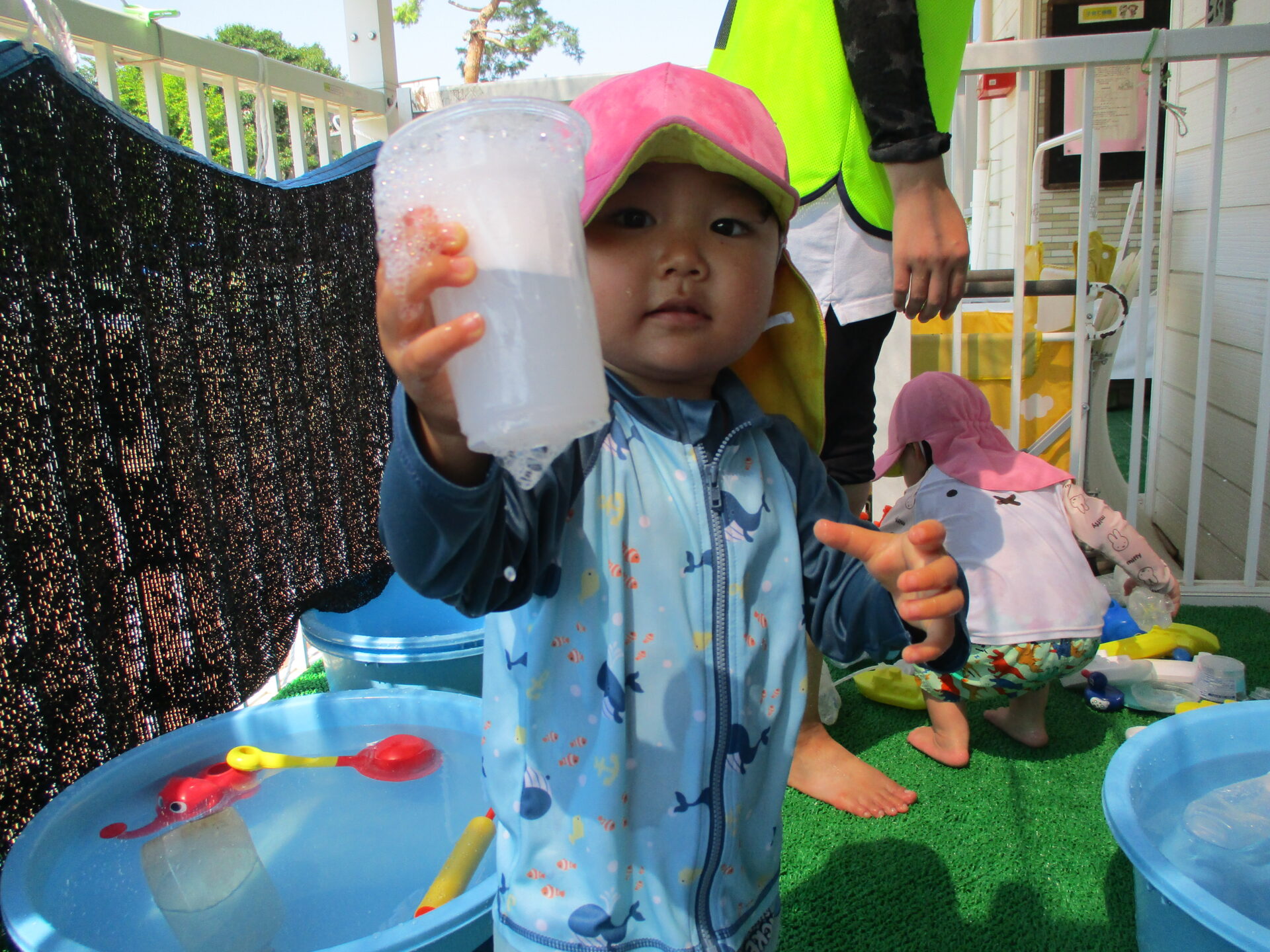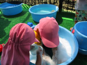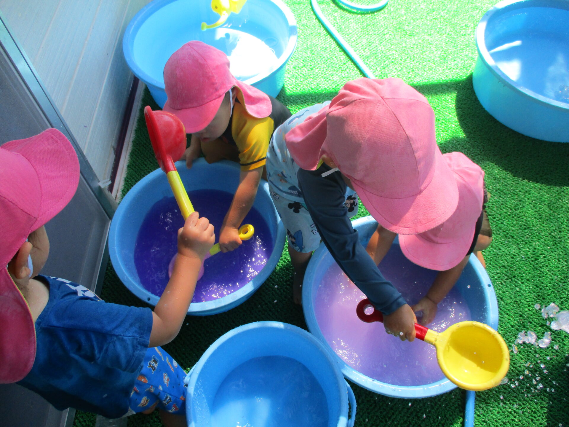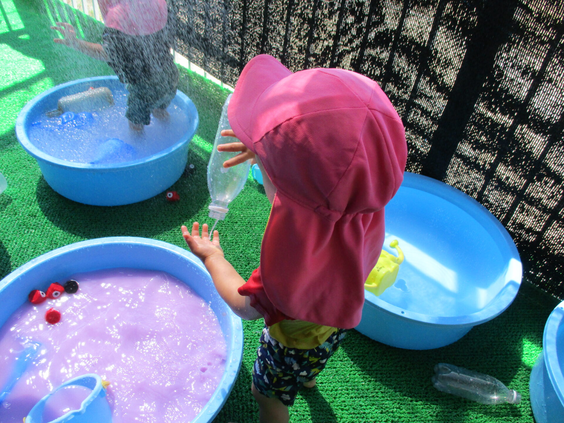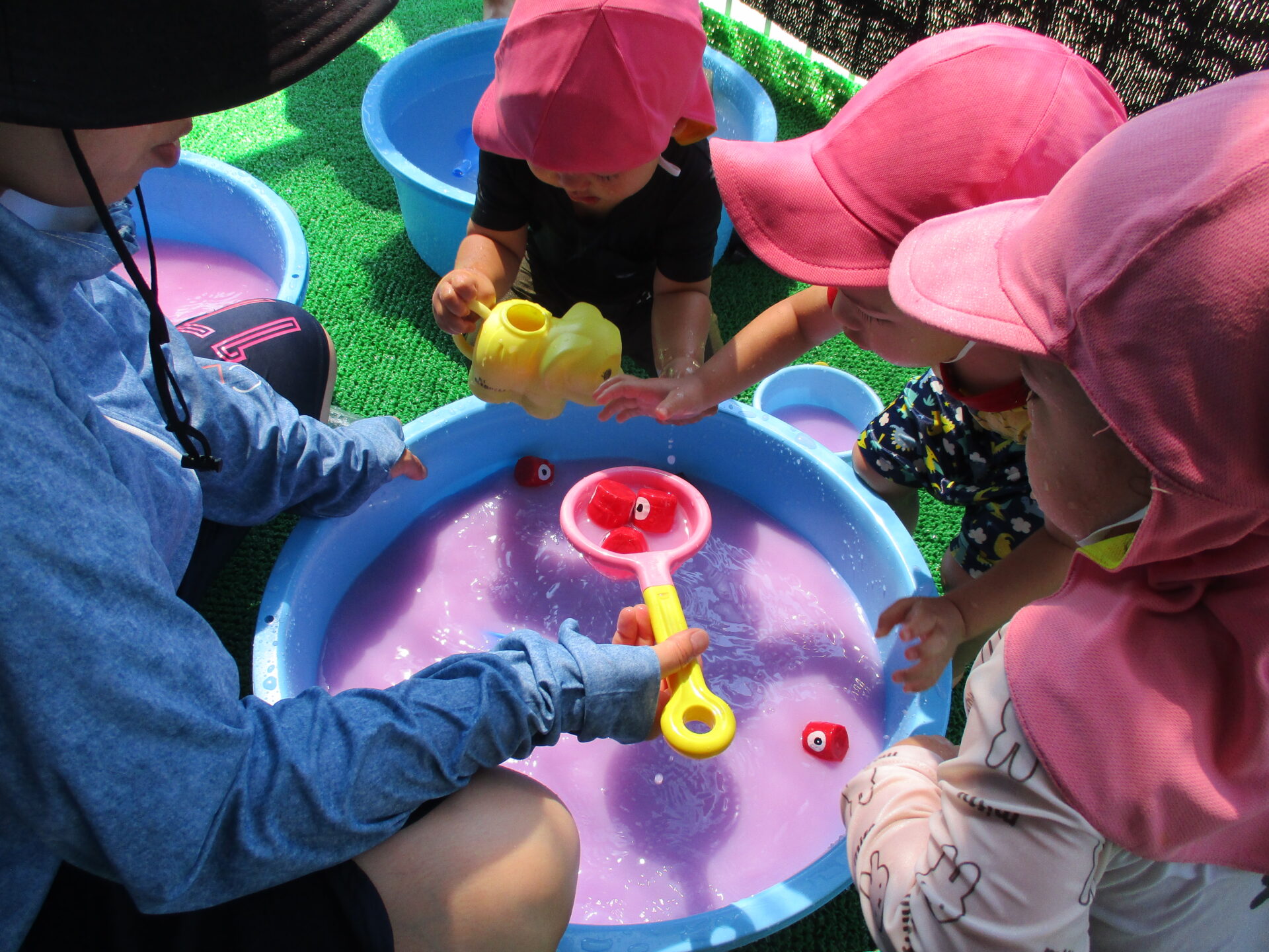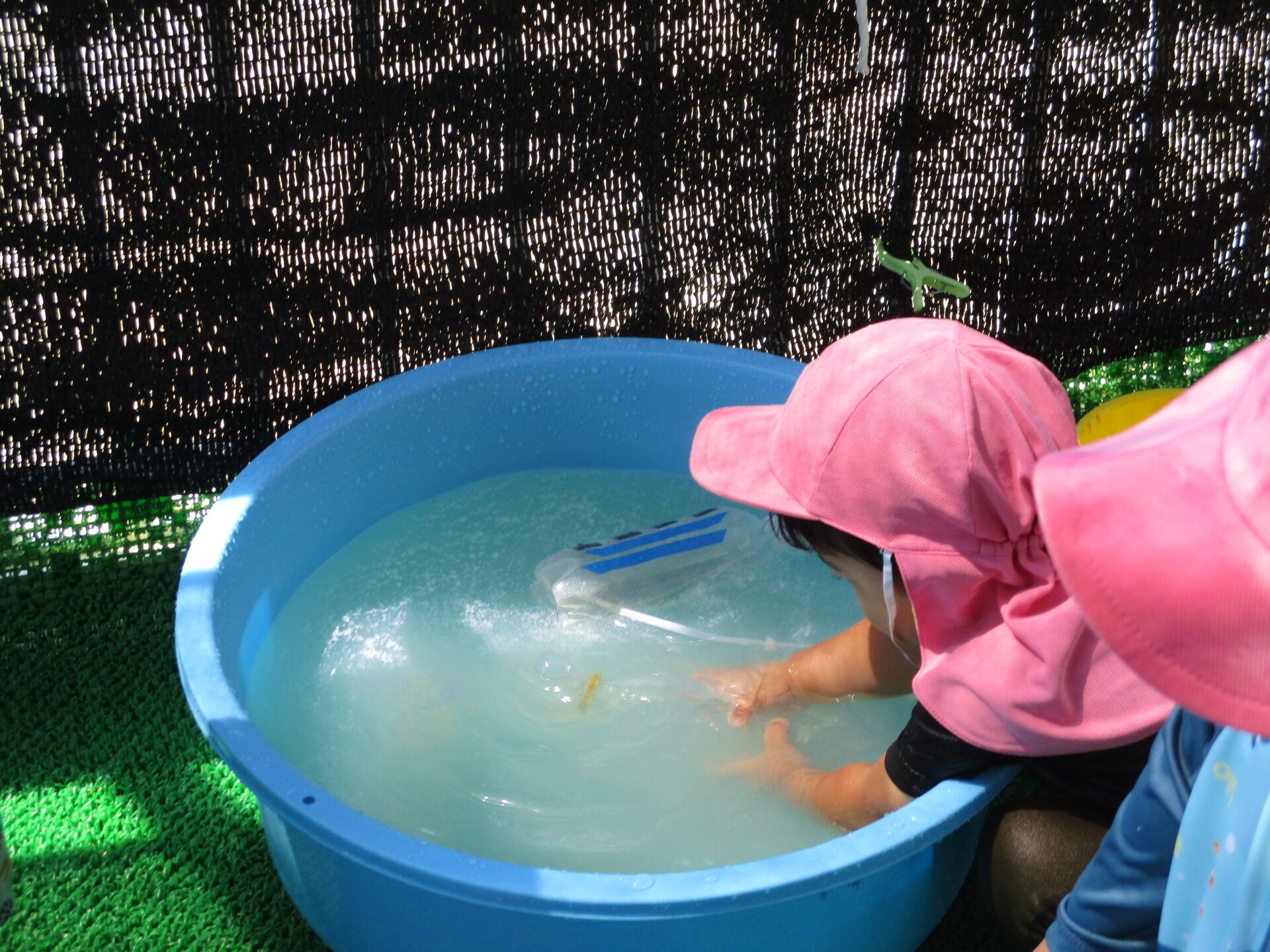 暑い日が続く中、ノンタン組では色々な素材やおもちゃを取り入れて水遊びを楽しんでいます。