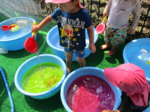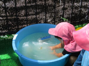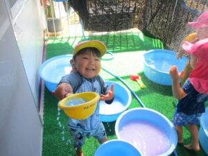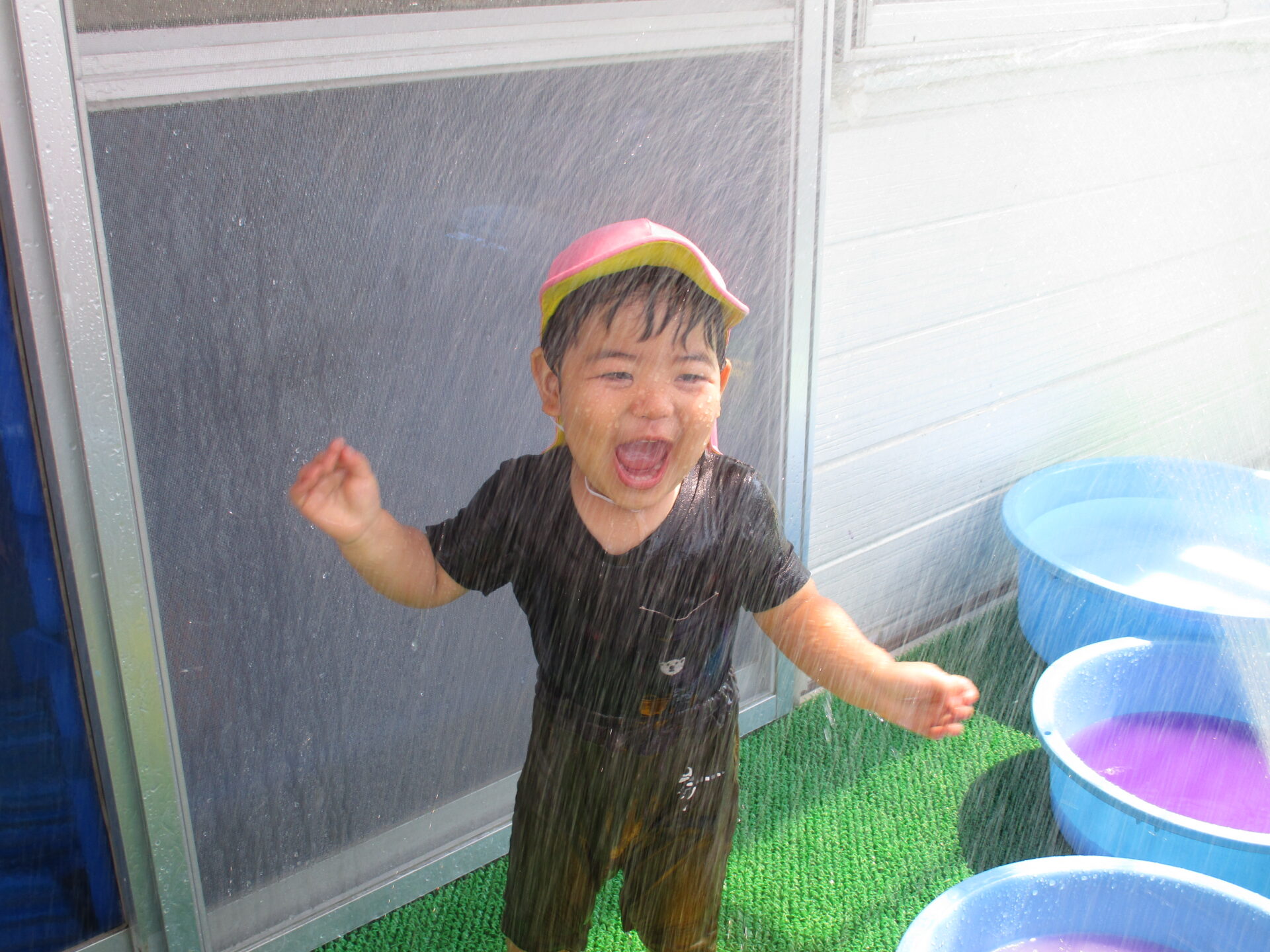はじめは怖がっていた子も回数を重ねるごとに水に慣れて思い切り遊べるようになってきました。水の冷たさや流れる感触、飛び散る水滴等、様々な感覚を五感で感じてほしいと思います。まだまだ暑いこの時期、夏ならではの水遊びを思い切り楽しんでほしいです。