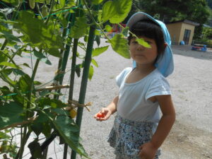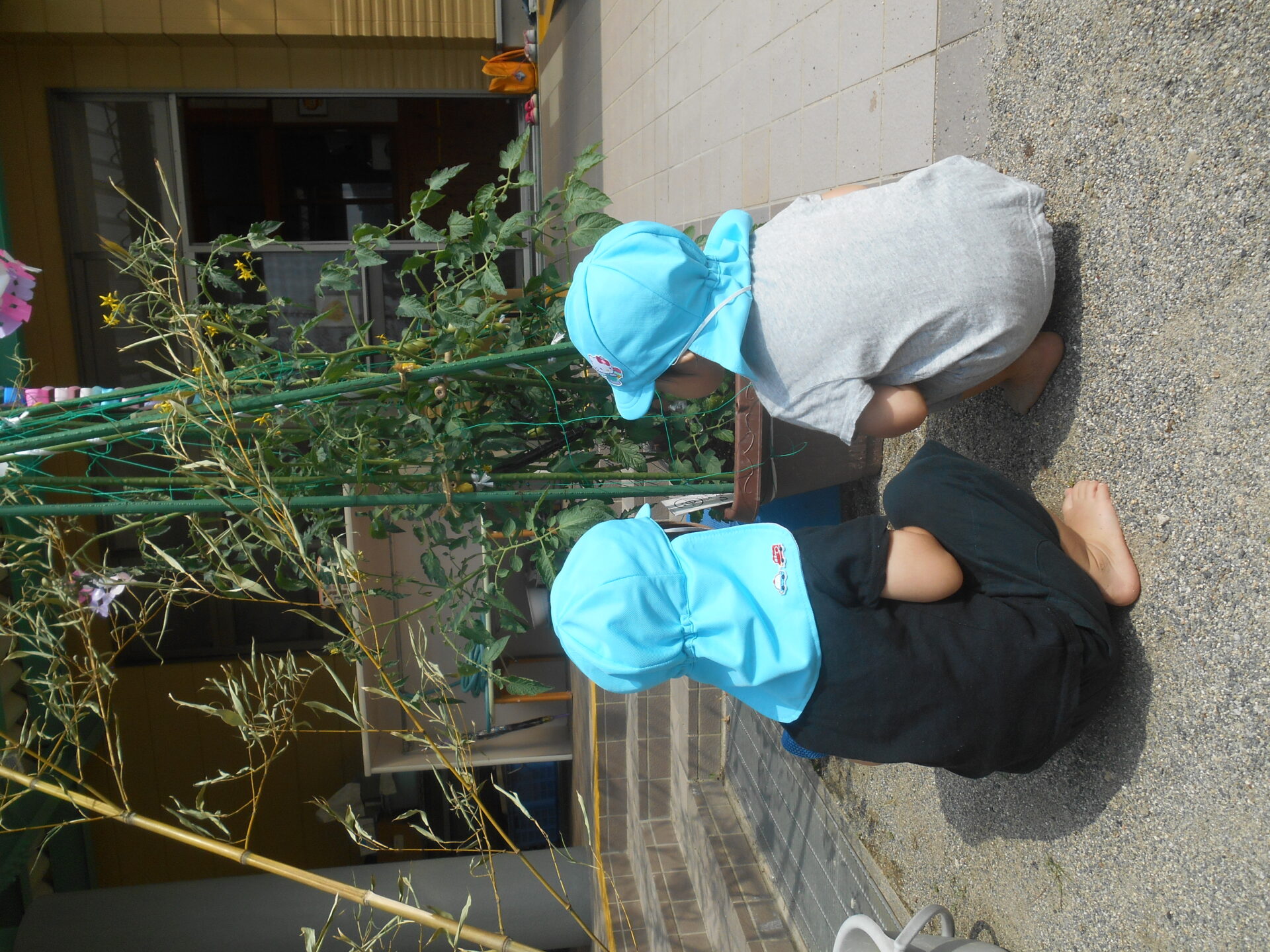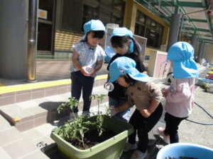 4月から、大きい組(3歳以上児)の遊びに興味をもって、虫探しをしながら裏にある畑に遊びに行っていました。大きい組さんの畑に少しずつ野菜の苗が植えられ、ちょっと気になっていた、ひよこ組さんたちのテラスの前に、ついにミニトマトの苗が!!