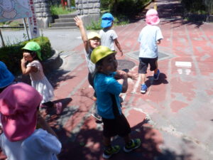 毎日午後になると、保育園の周りの桜の木からセミの大合唱が聞こえてきます。午睡前にトイレに行くとトイレの窓から大きな声、「あれはセミだ!」「ぼくも知ってるよ。アブラゼミとか」などと話がはずみます。「つかまえたいな。」「「セミ見てみたい。」などの声が日に日に高まり、午睡前のわずかな時間でセミを見に行ってみることにしました。