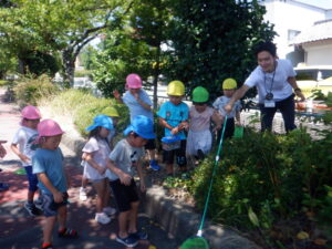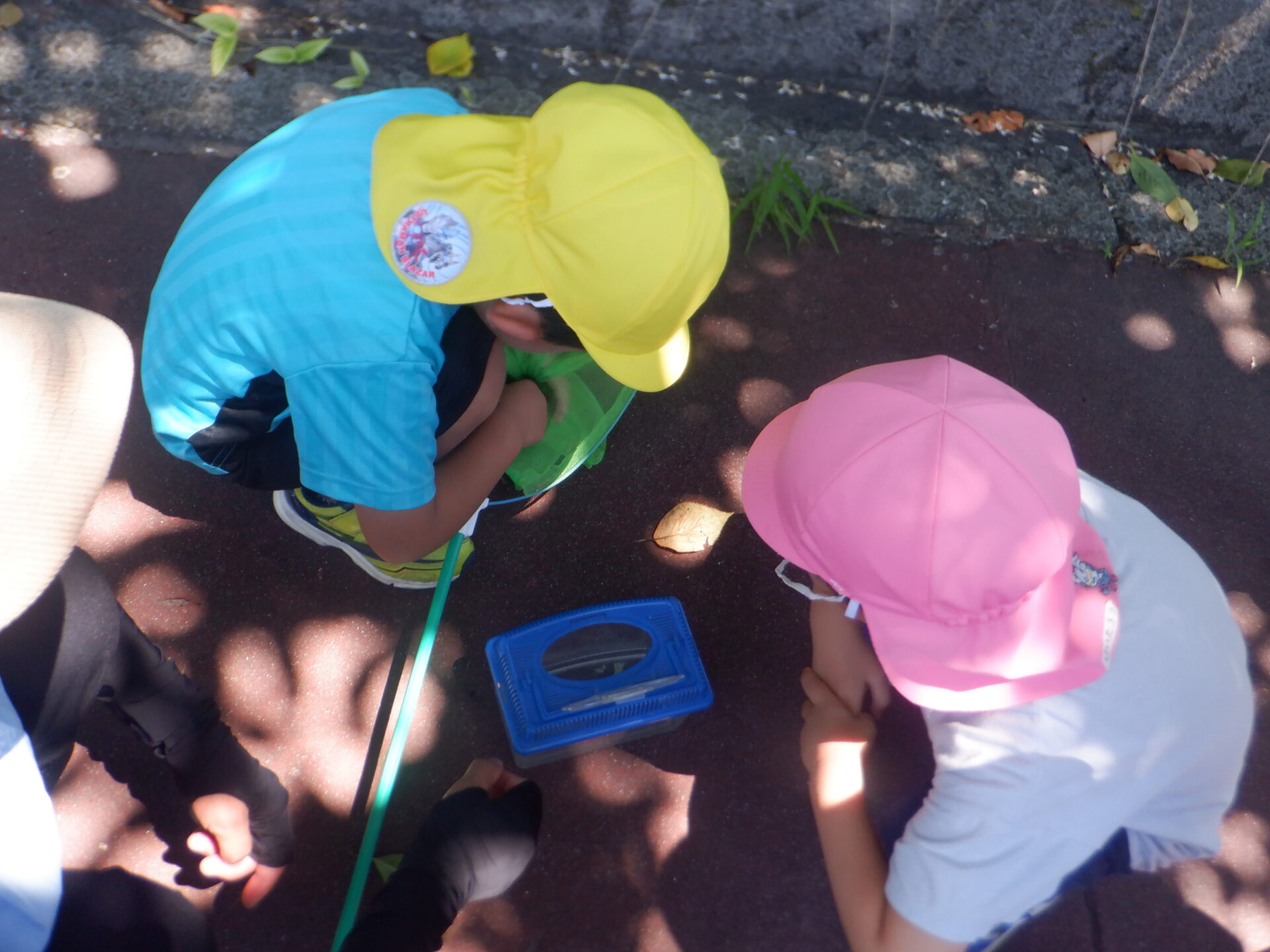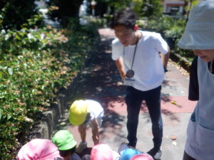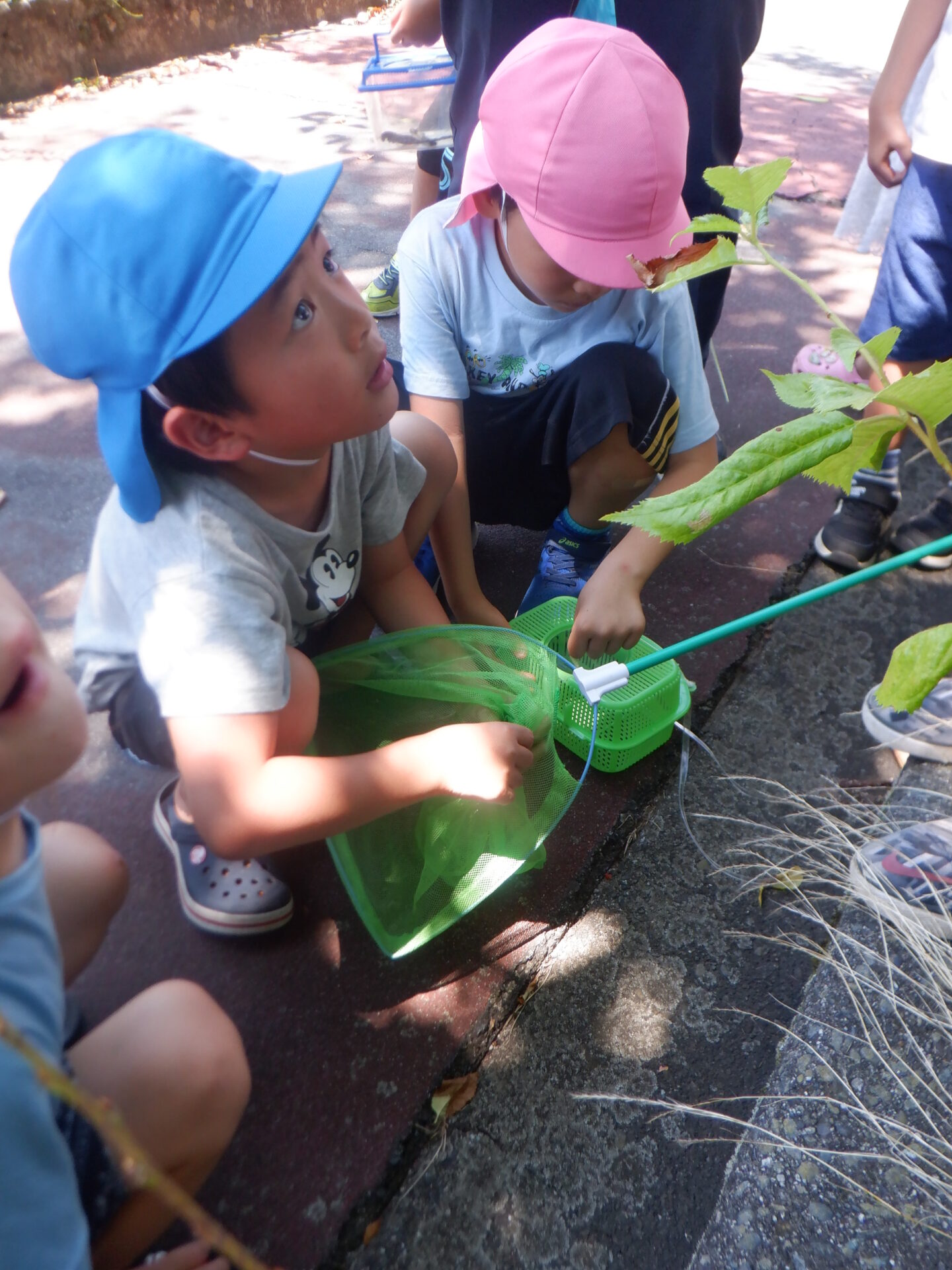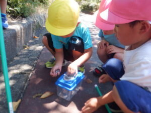 虫が好きな子もいて、今はセミ取りが楽しく、家から虫かごを持って登園してくる子もいます。セミの命が短いことは伝え、大事にすることは意識しているようですが、せっかく興味を持っている今なので、取って逃がすだけにならず、もう少しセミのことや他の虫のことに関心を持っていけるように関わっていきたいと思います。