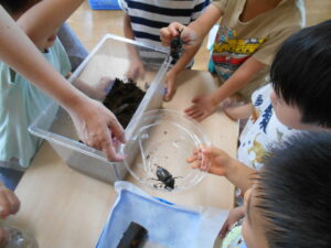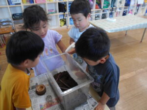 土の中の幼虫の時から図鑑を広げて「今はこんな感じで寝ているのかもね。」と出てくるのを心待ちにしていました。実際に触れた時には「優しく持たないとかわいそうだよ。」という声が聞こえ、1匹お空へ行ってしまった時には「お墓を作ってあげよう。」という子もいました。子どもたちの心の中に優しい気持ちが育っていて嬉しく思いました。本物の生き物との触れ合いを通して生長する喜びや命の大切さをさらに感じていけたらいいなと思います。
