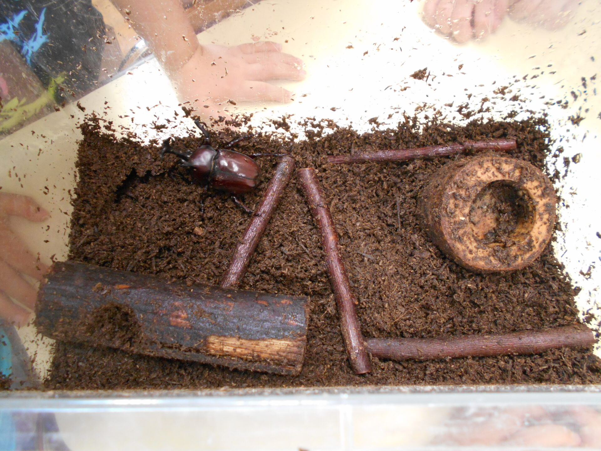 「カブトムシに水がかからないようにね!」「ゼリーそろそろあげた方がいいんじゃない?」「大変!ひっくり返ってるよ!」
