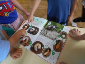 ・土の中に小さな白い丸が二つ。もしかして!?と、図鑑を開いてみました。「タマゴだー!!」