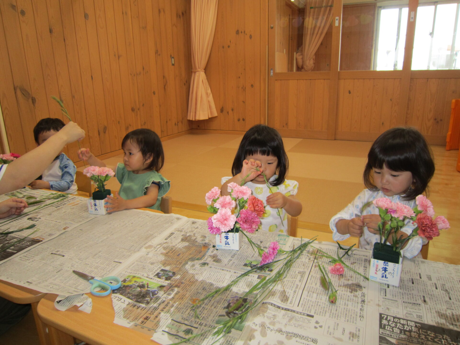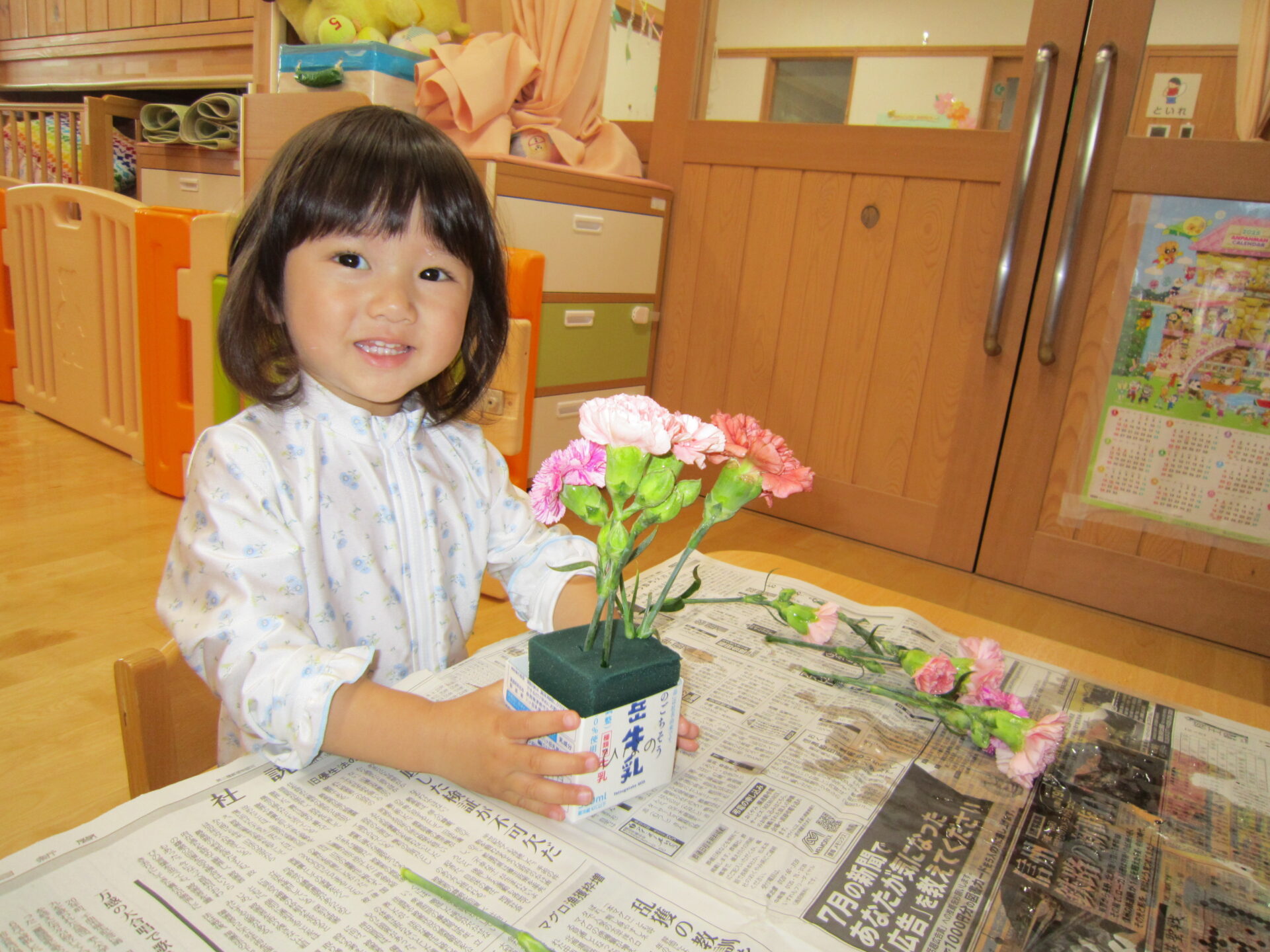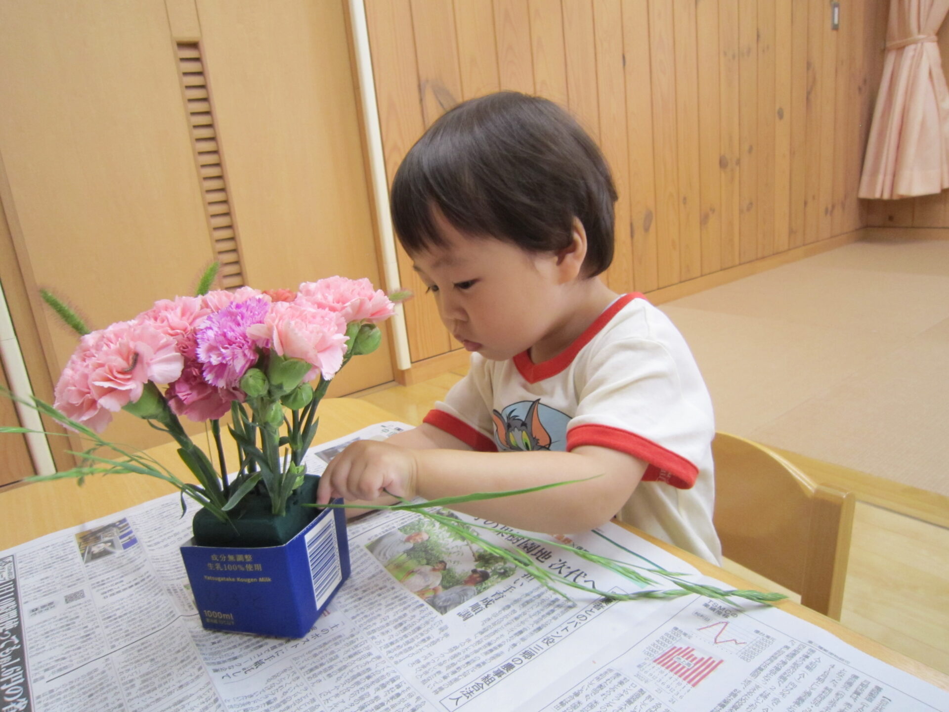 自然にお花に触れ始めながら、保育士がオアシスの場所を示すことで、アレンジメントをすることができました。