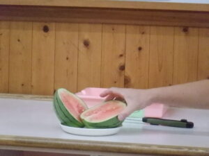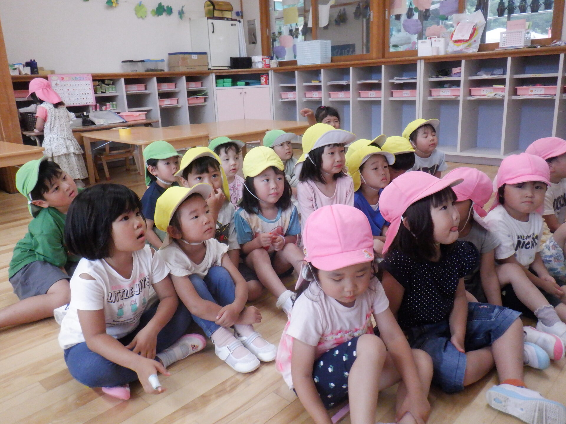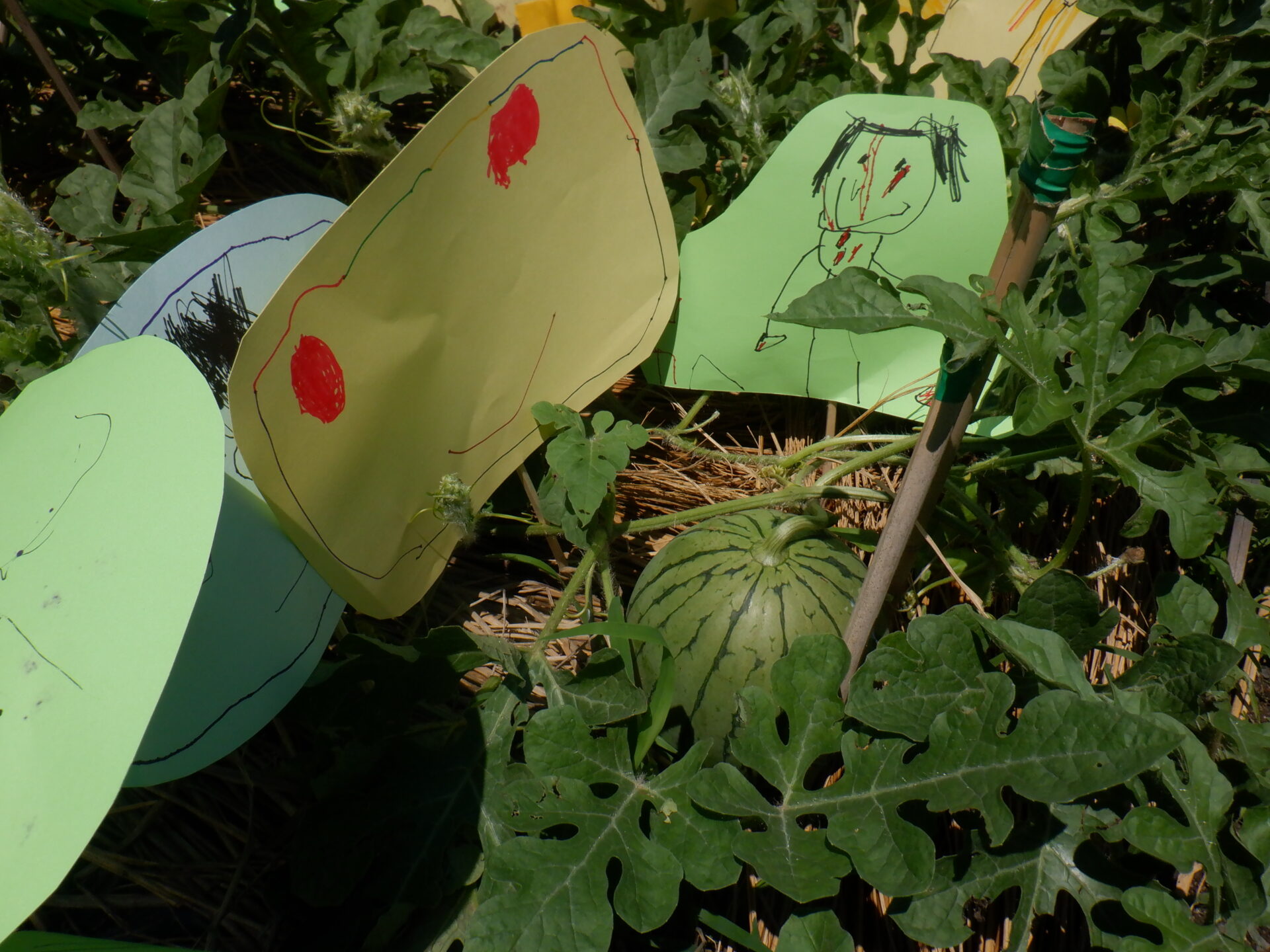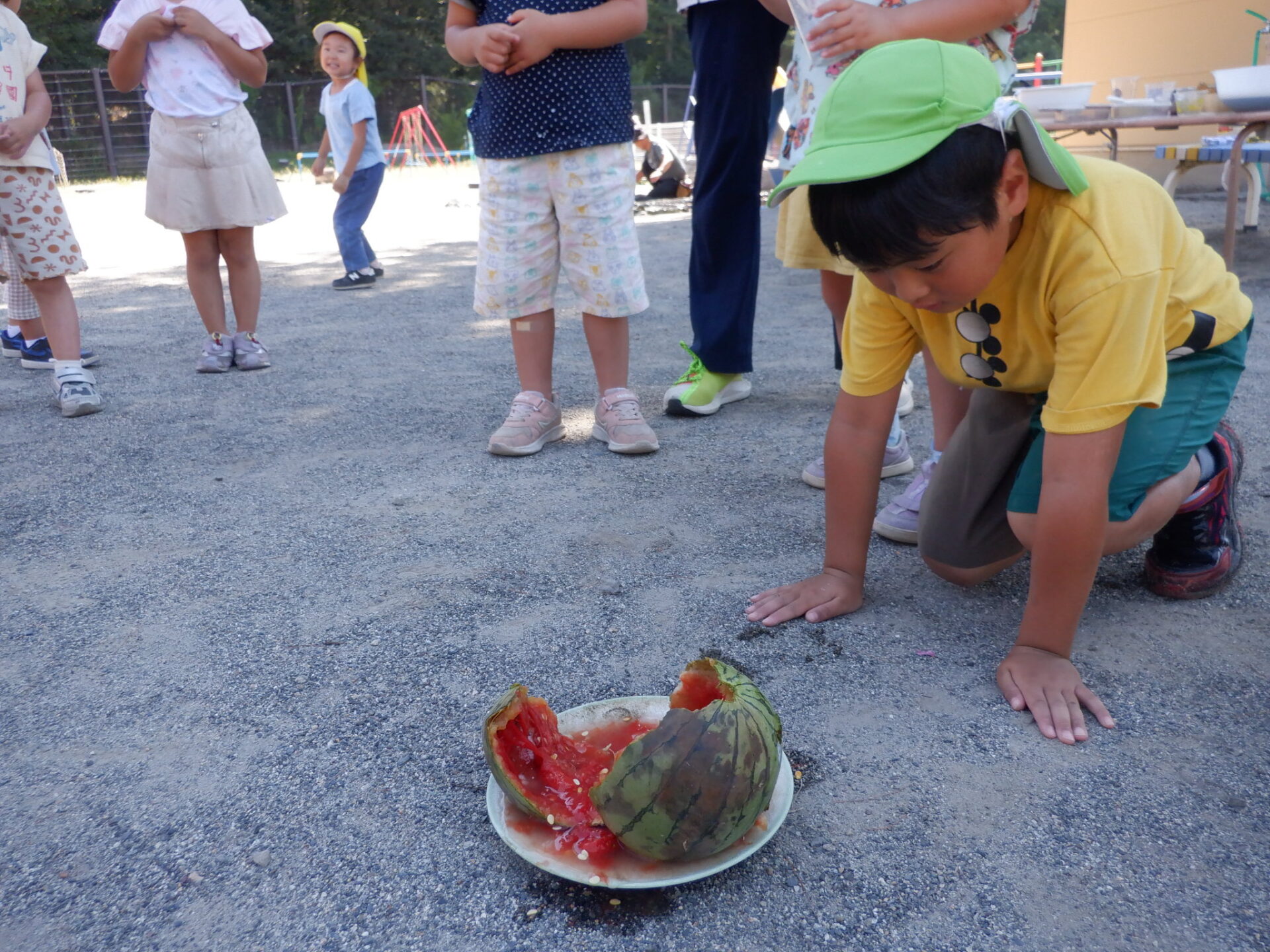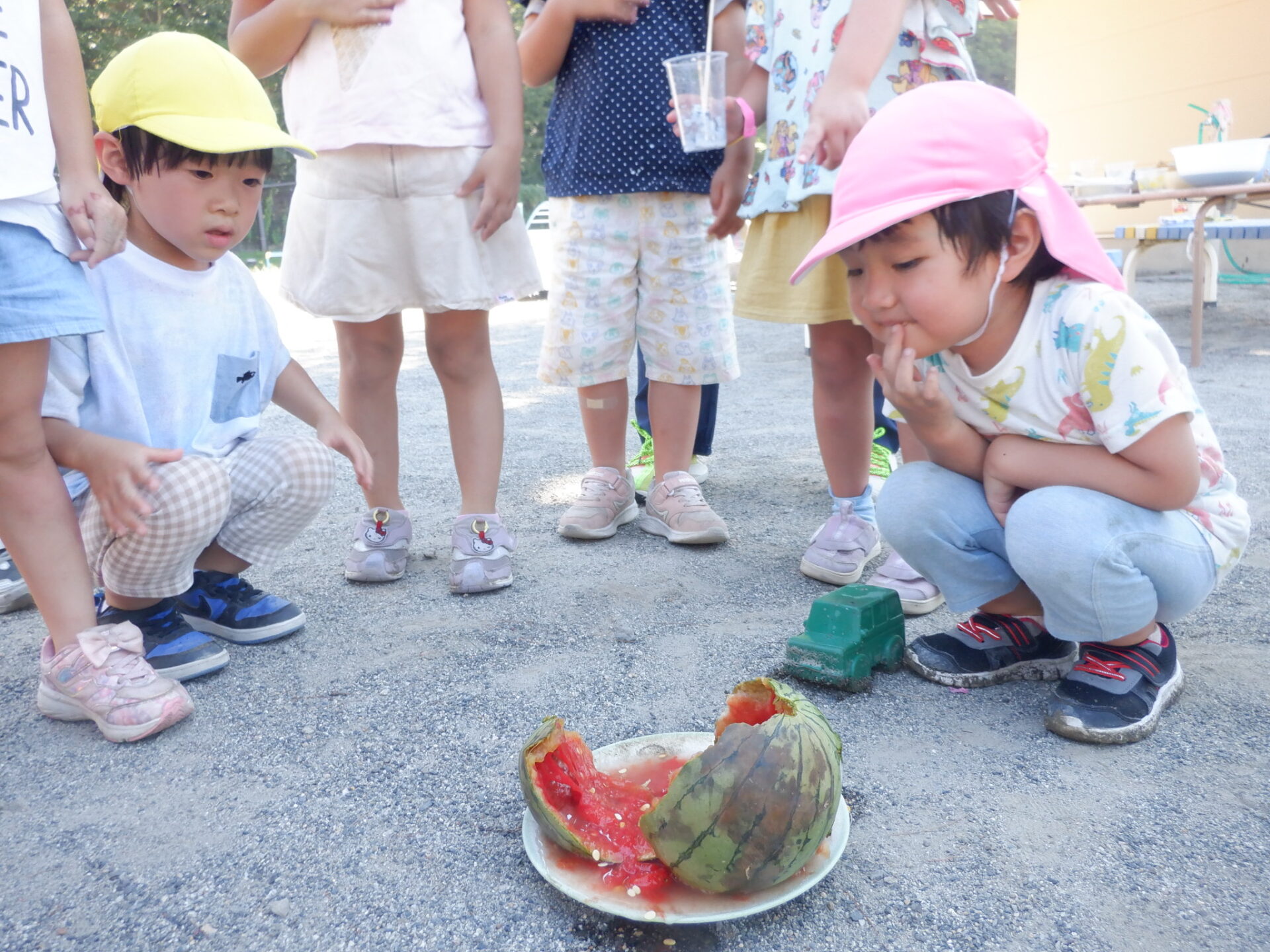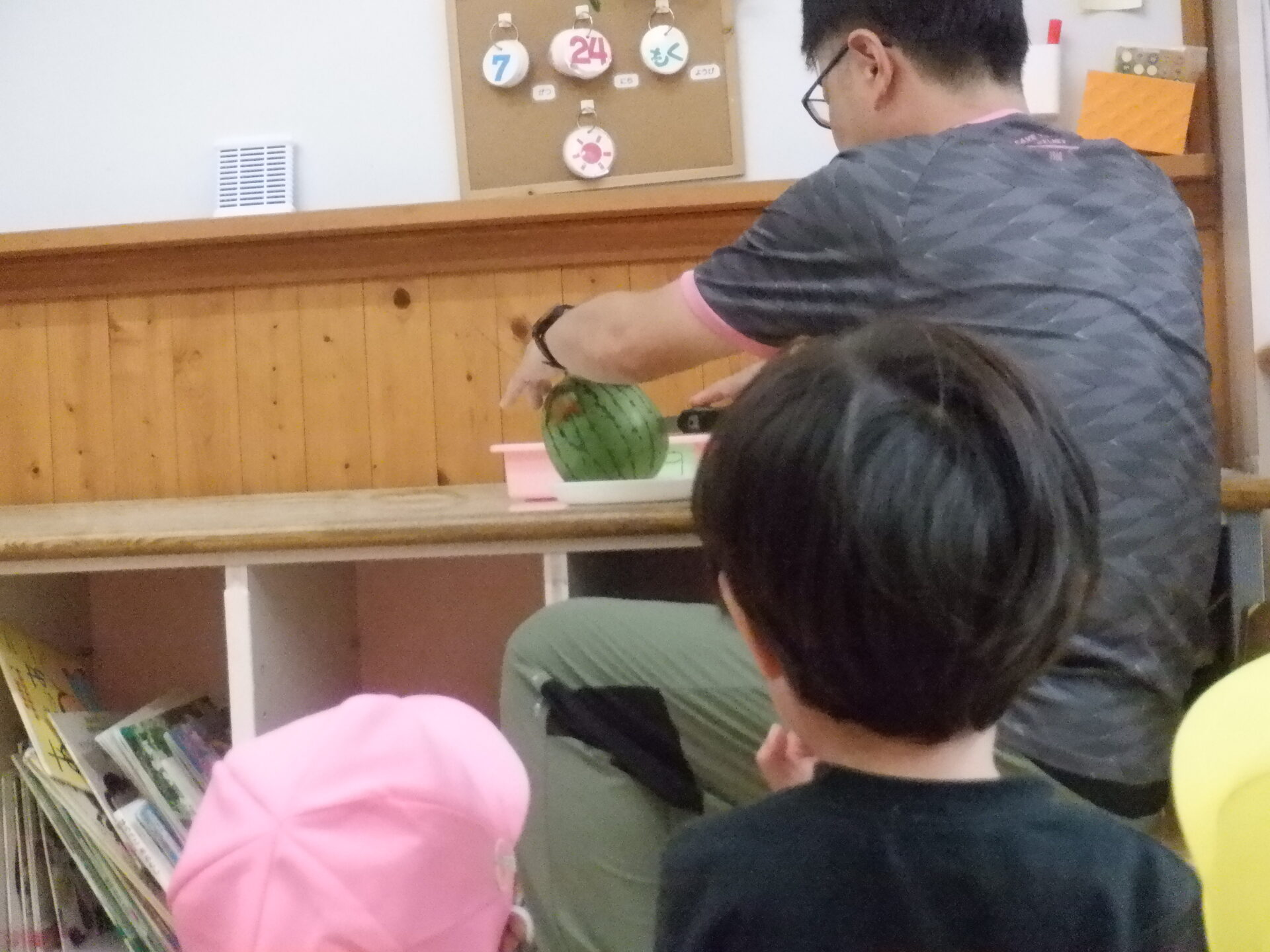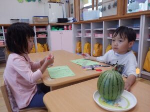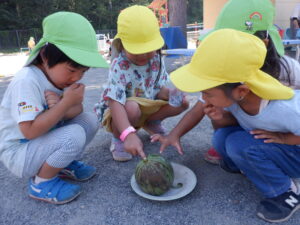 この日の帰り。食べられなかったスイカを切ってみたり、匂いを嗅いでみたりした後にスイカを発見した年中さんが「スイカ見守り隊」に任命されました。