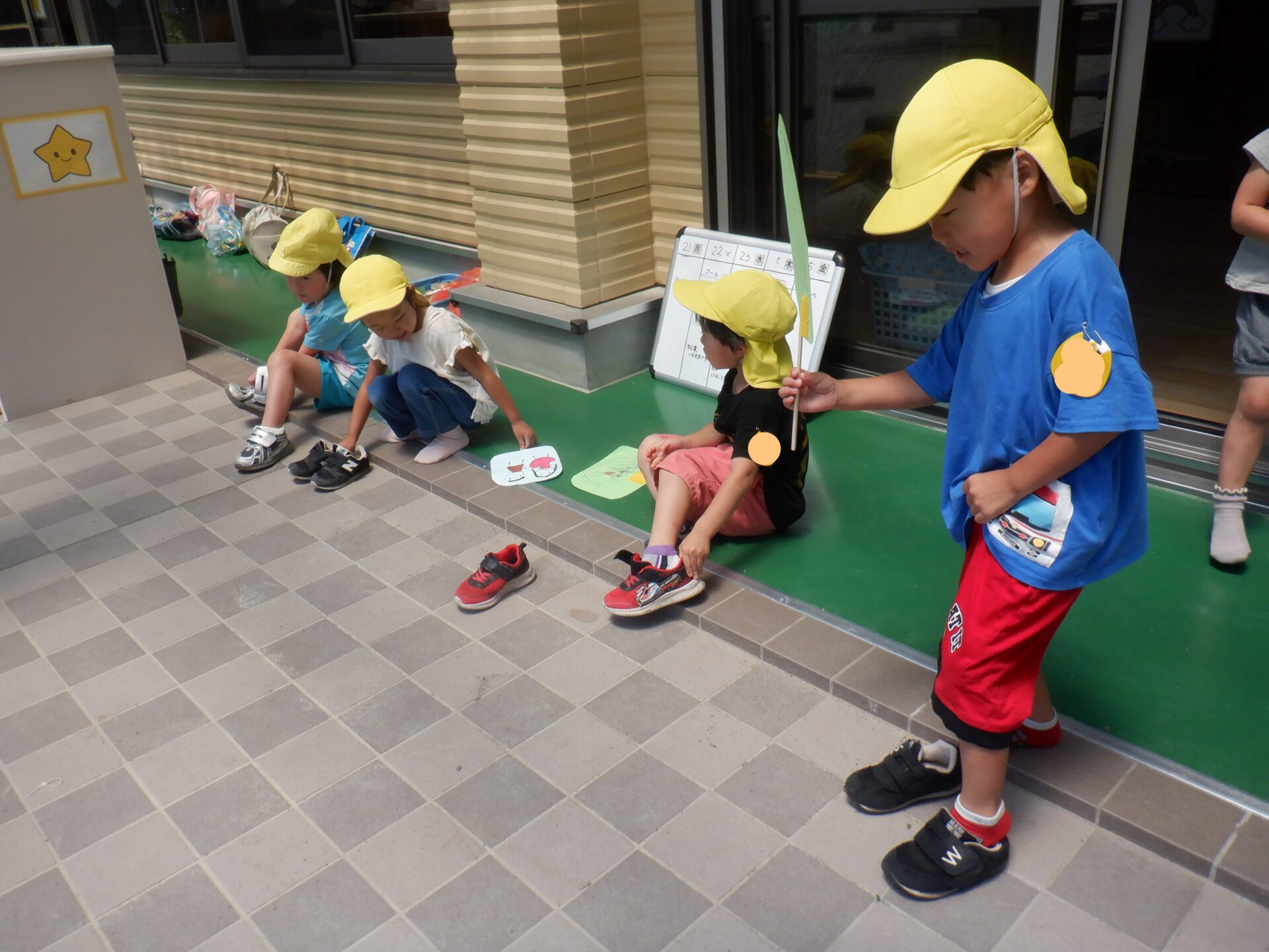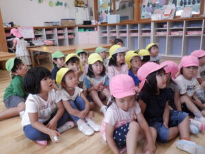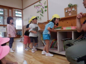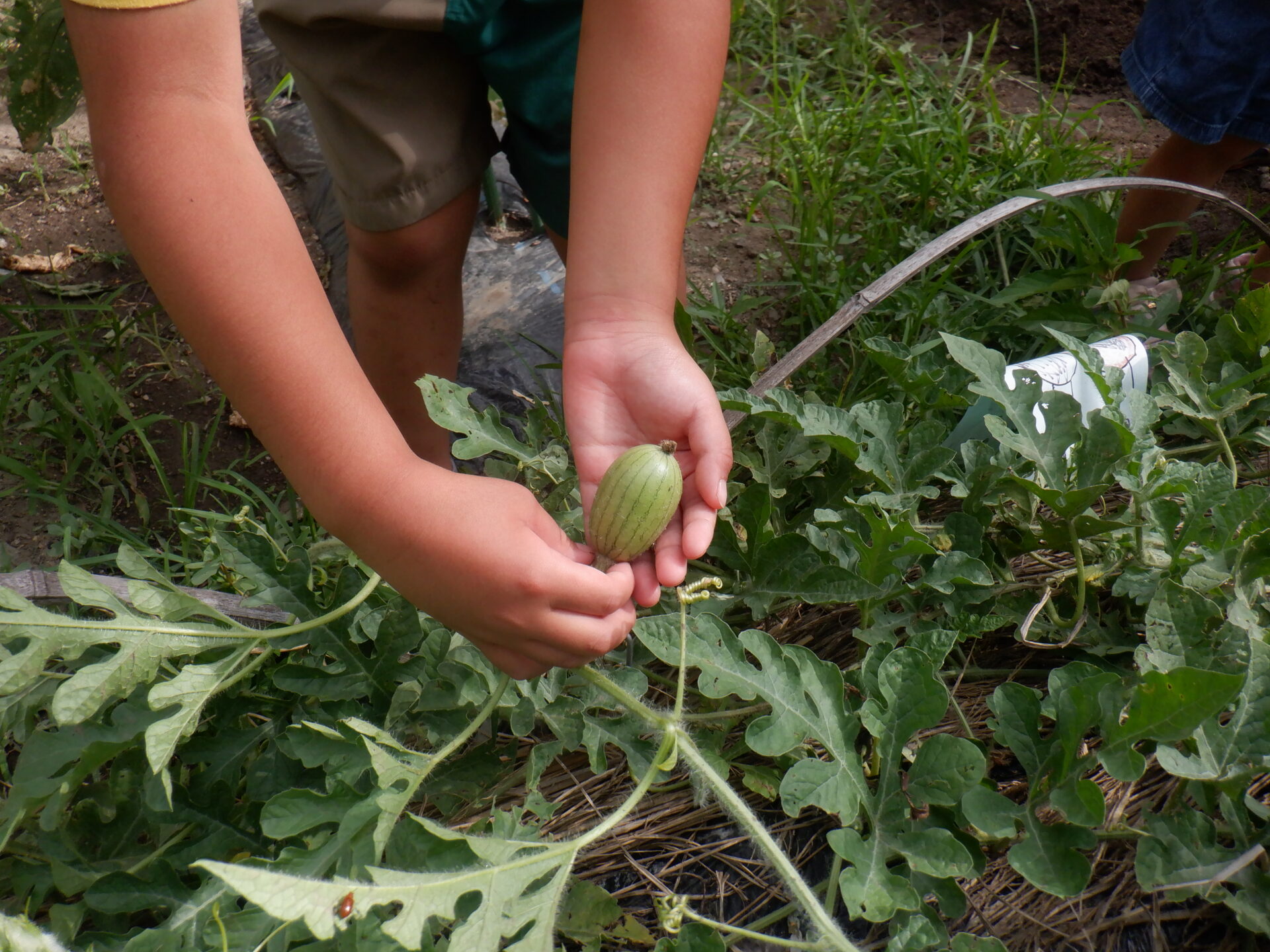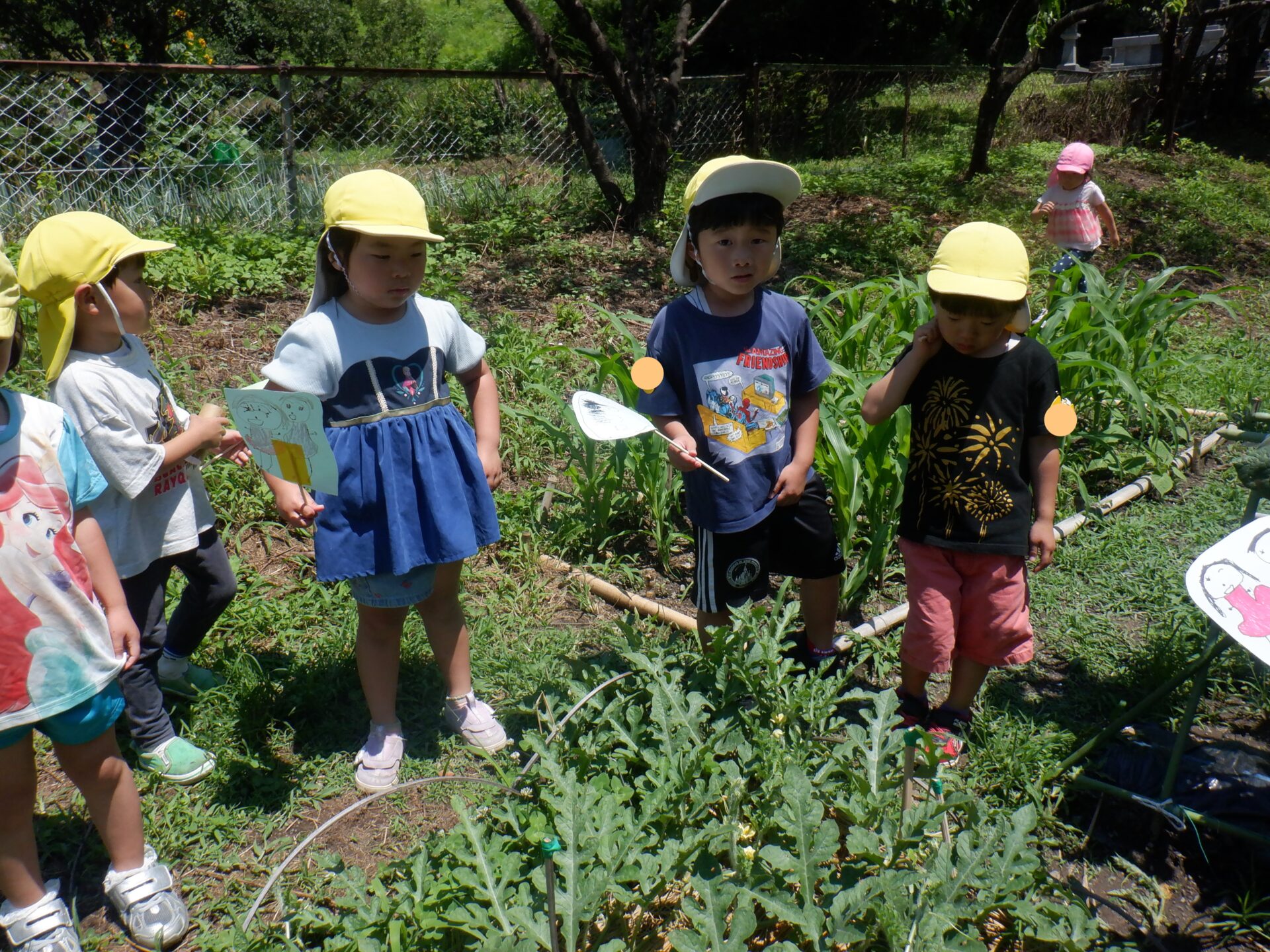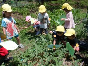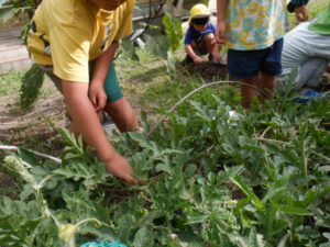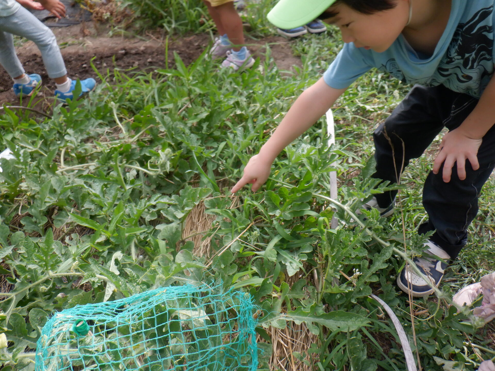 この後スイカの赤ちゃんを見つけました。「スイカ見守り隊」に任命された年中児のお仕事はまだまだ続きそうです。スイカも子ども達も大きく成長してくれることを楽しみにしています。