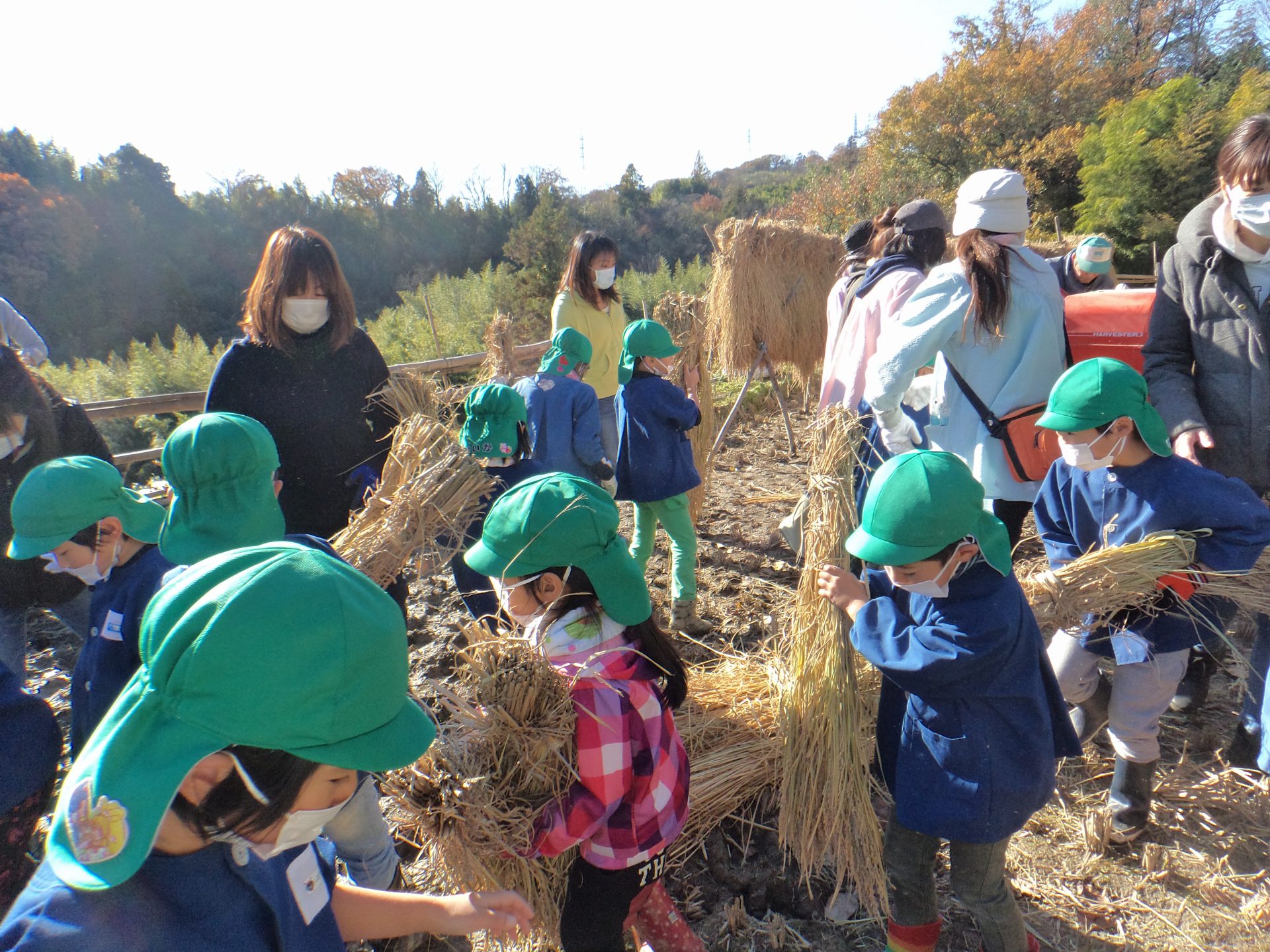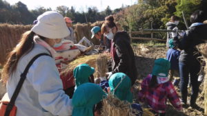 子ども達は稲の束を運んでいきました。うるち米ともち米の2種類です。力のある子どもたち、次々に稲束を運んでいきます。