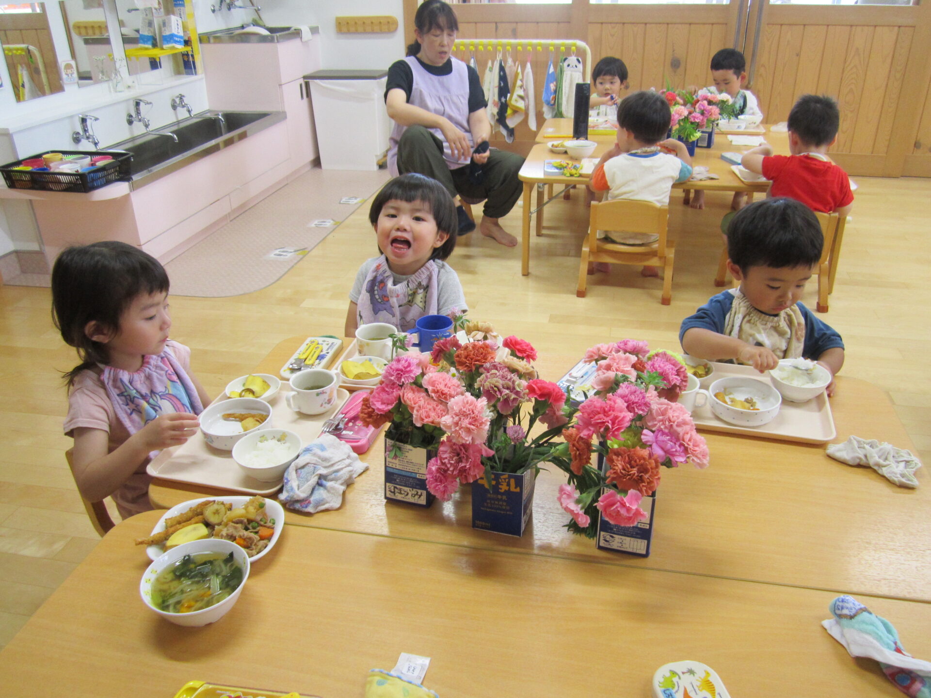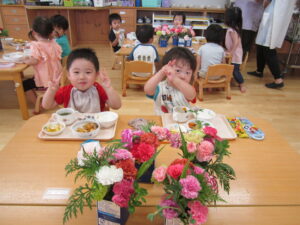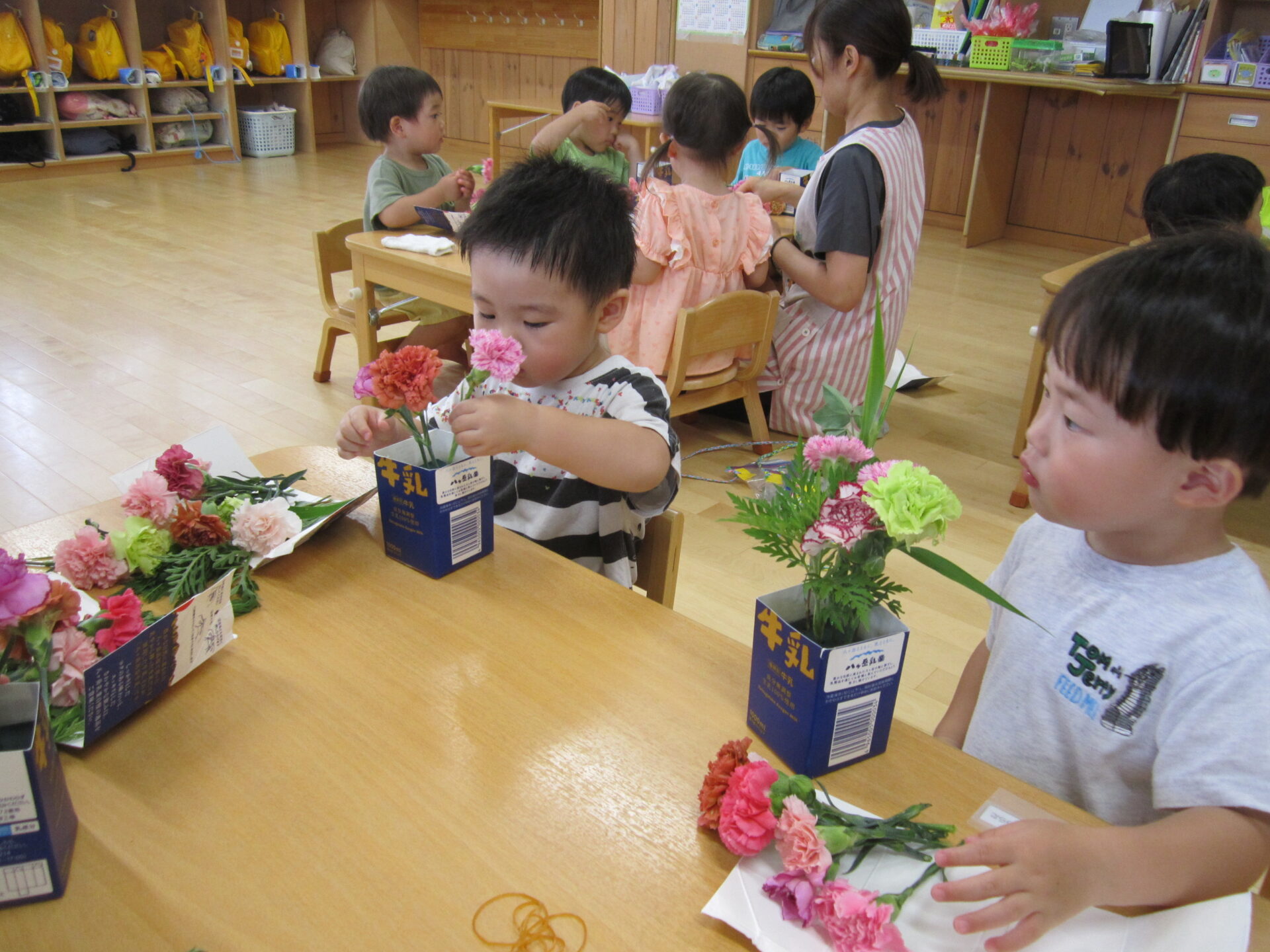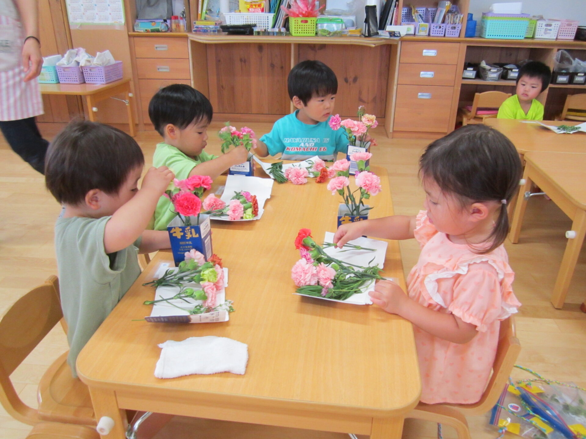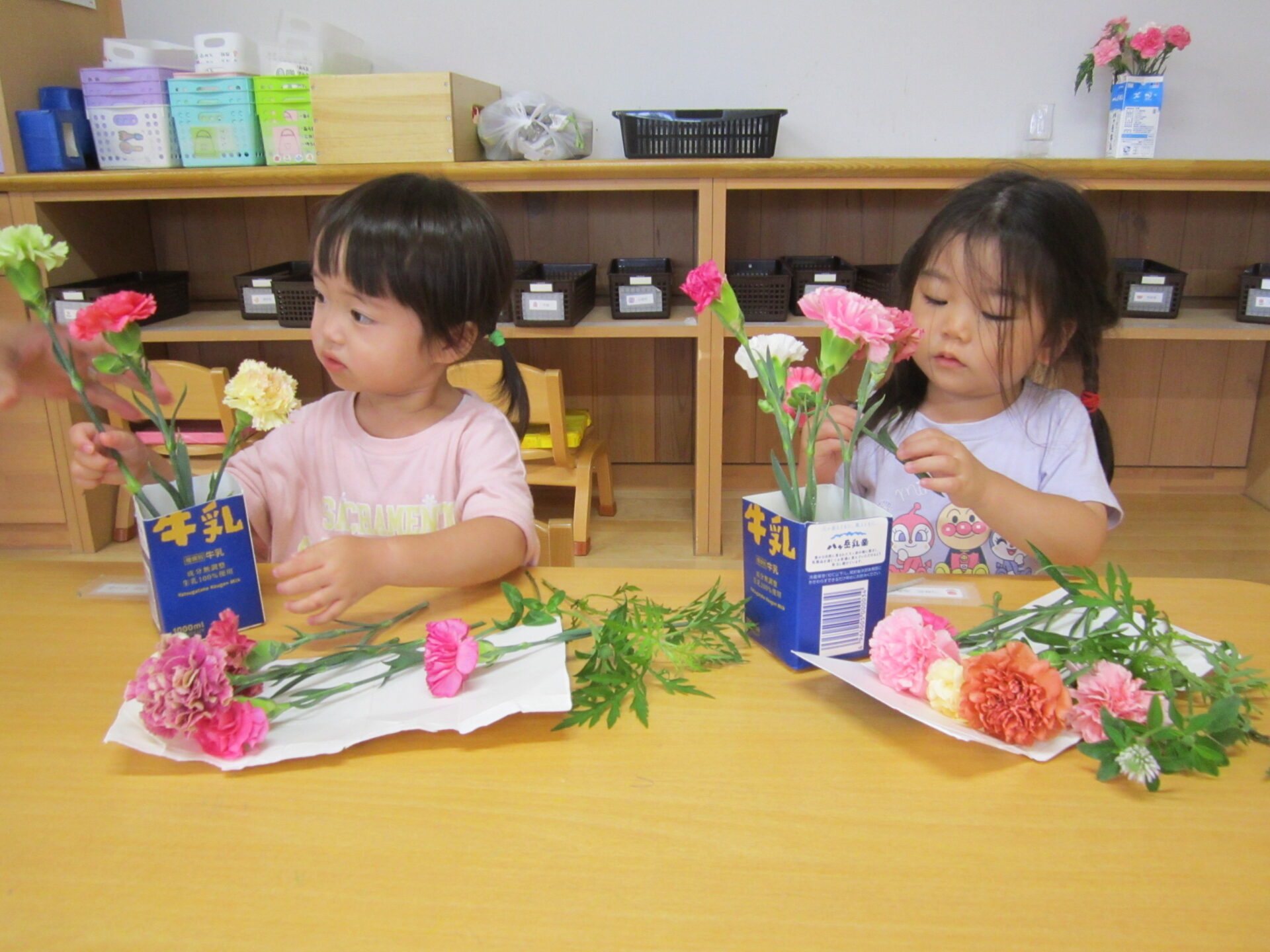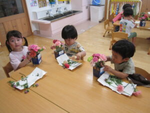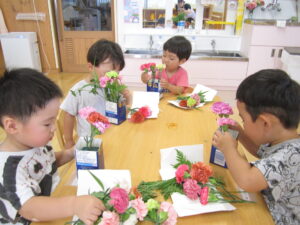 お花を見て「きれいだね」と言ったり、鼻を近づけて匂いをかいだり、五感を使って楽しむ姿がありました。真剣な眼差しでお花を生けている姿にいつもとは違う姿を見ることができました。