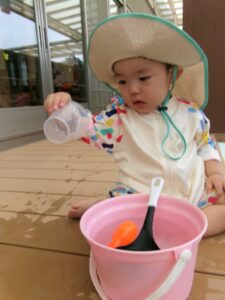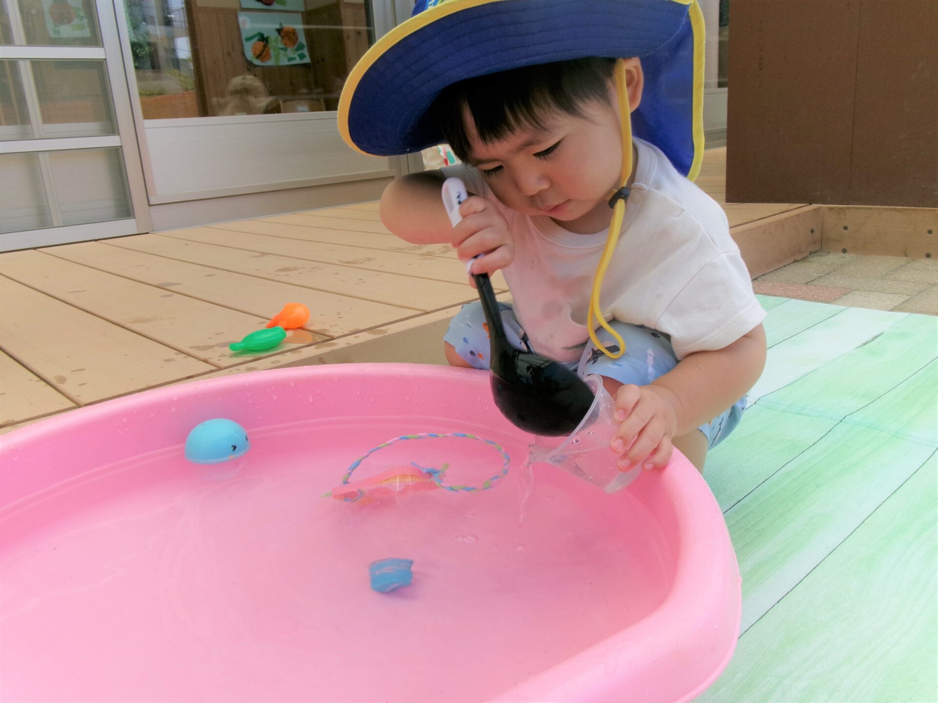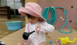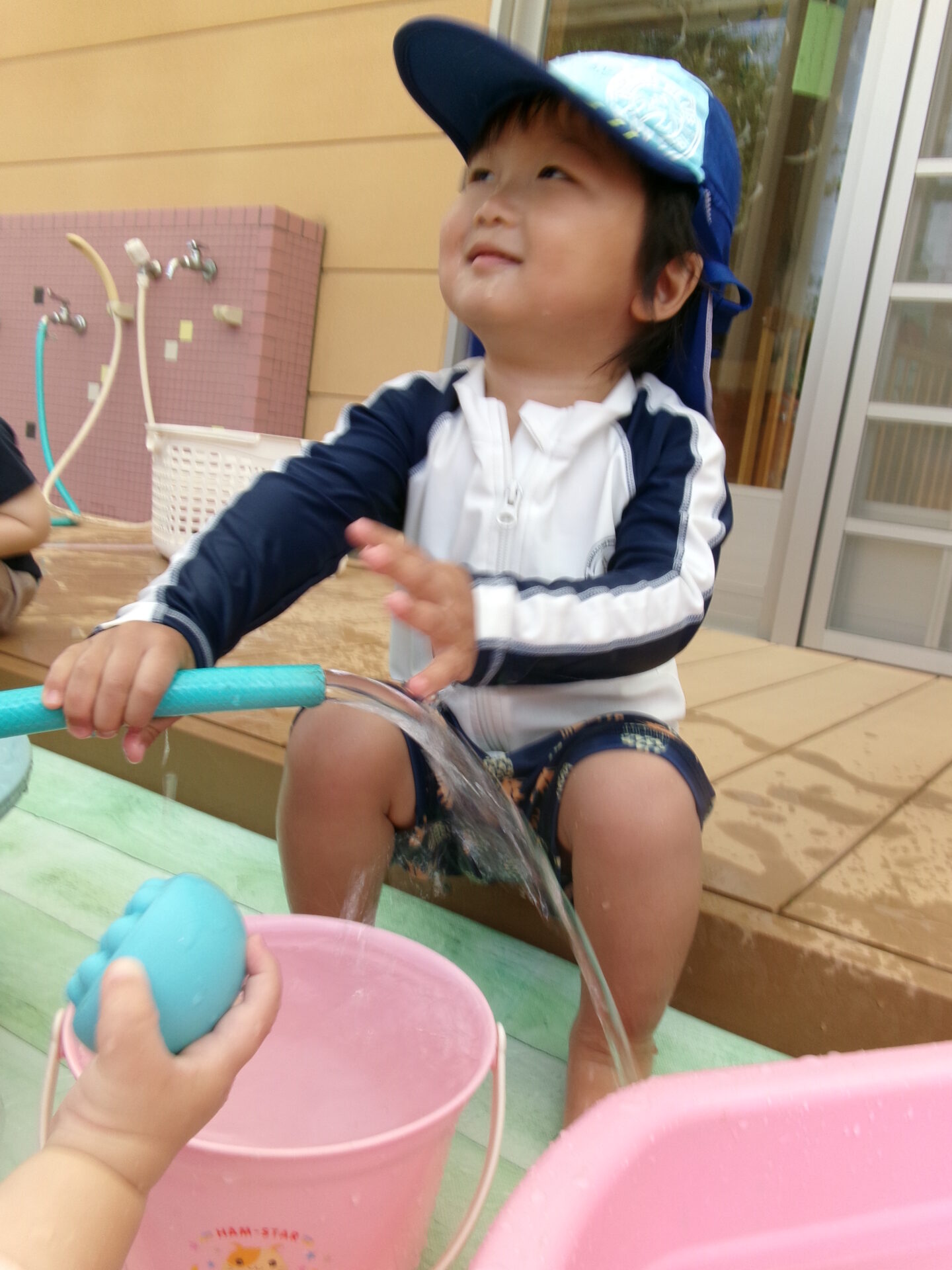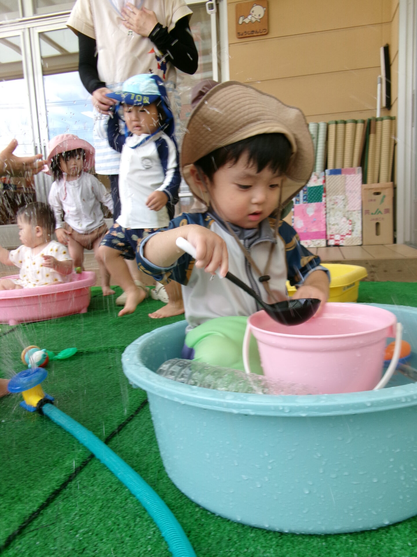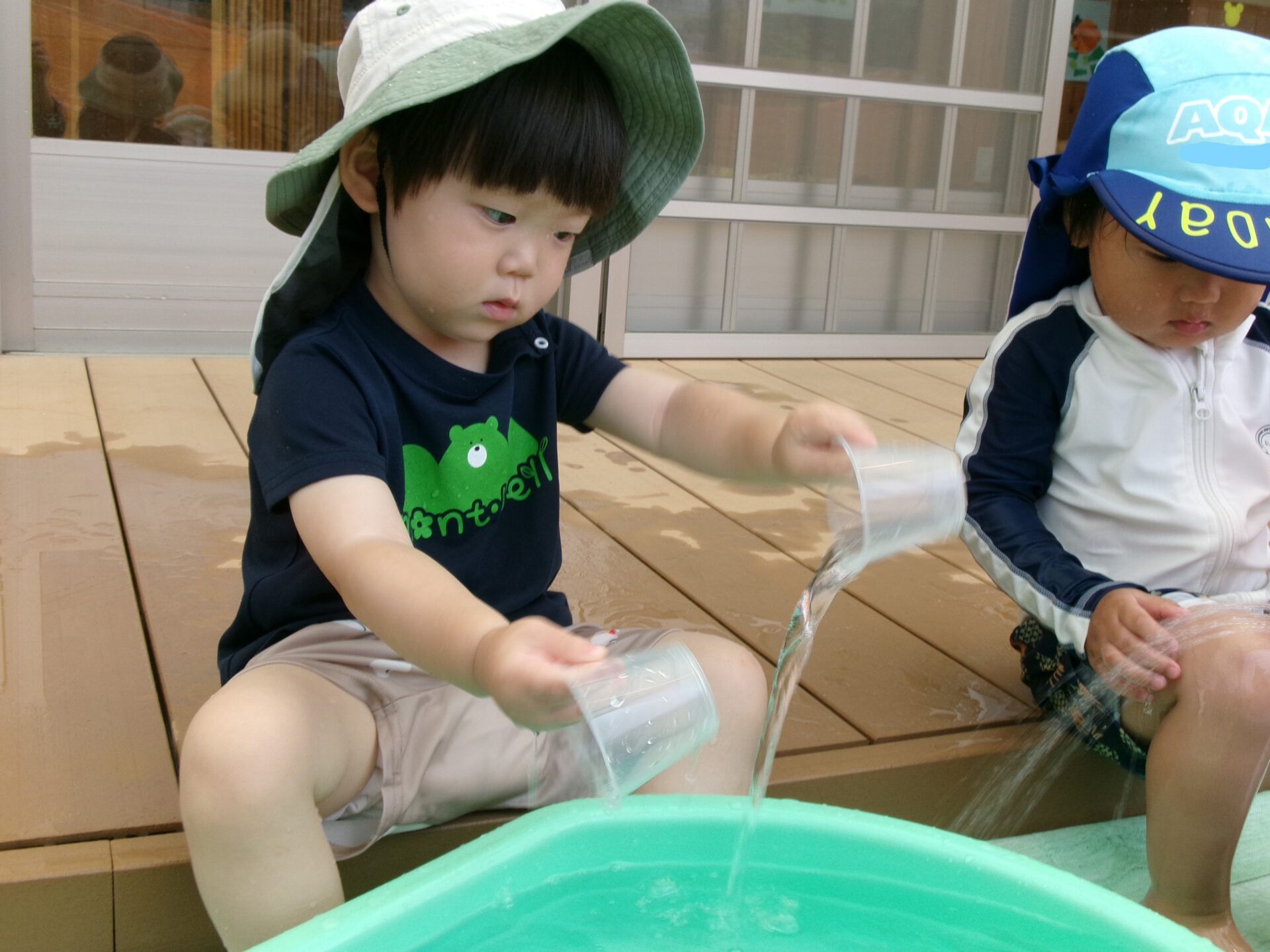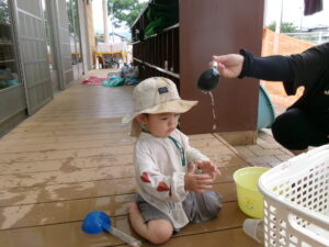 水あそびの玩具などであそびながら、水に触れる気持ちよさや、冷たさ、音などを楽しむ姿がみられました。