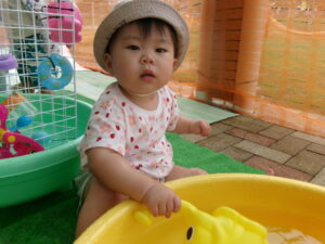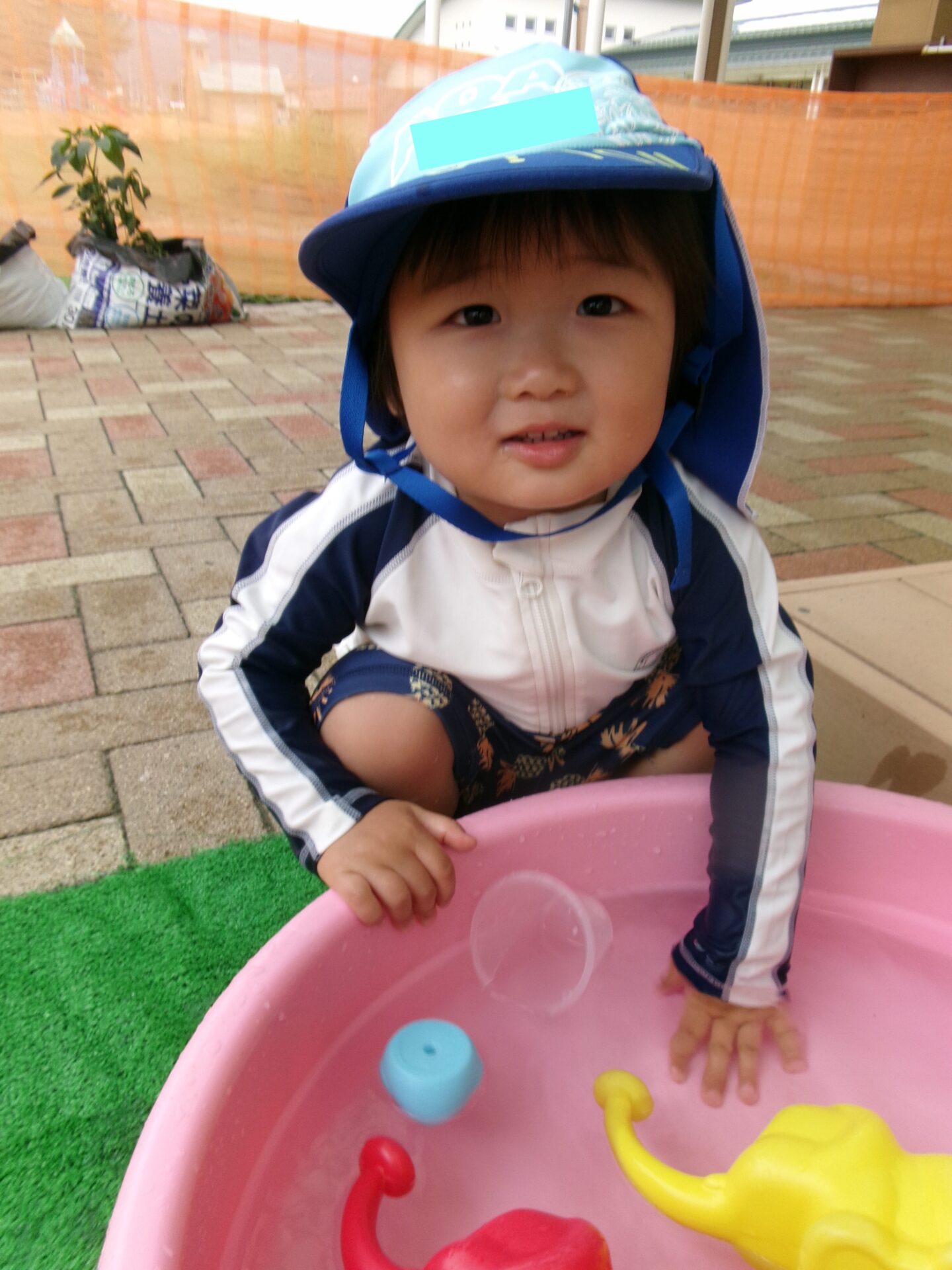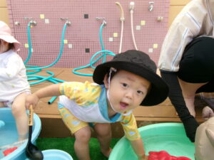 水の入ったタライやバケツを複数用意し、それぞれのペースで遊べるようにしました。水を怖がっていた子も、回数を重ねるごとに水に親しみ感触を楽しめるようになってきました。手、足で水の感触や気持ちよさを感じながら、水あそびを思いきり楽しんでほしいと思います。