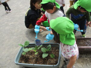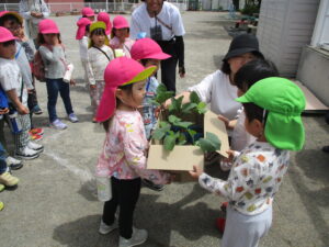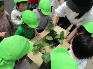 年中さんに地域のお店でナスの苗を買ってきてもらい、