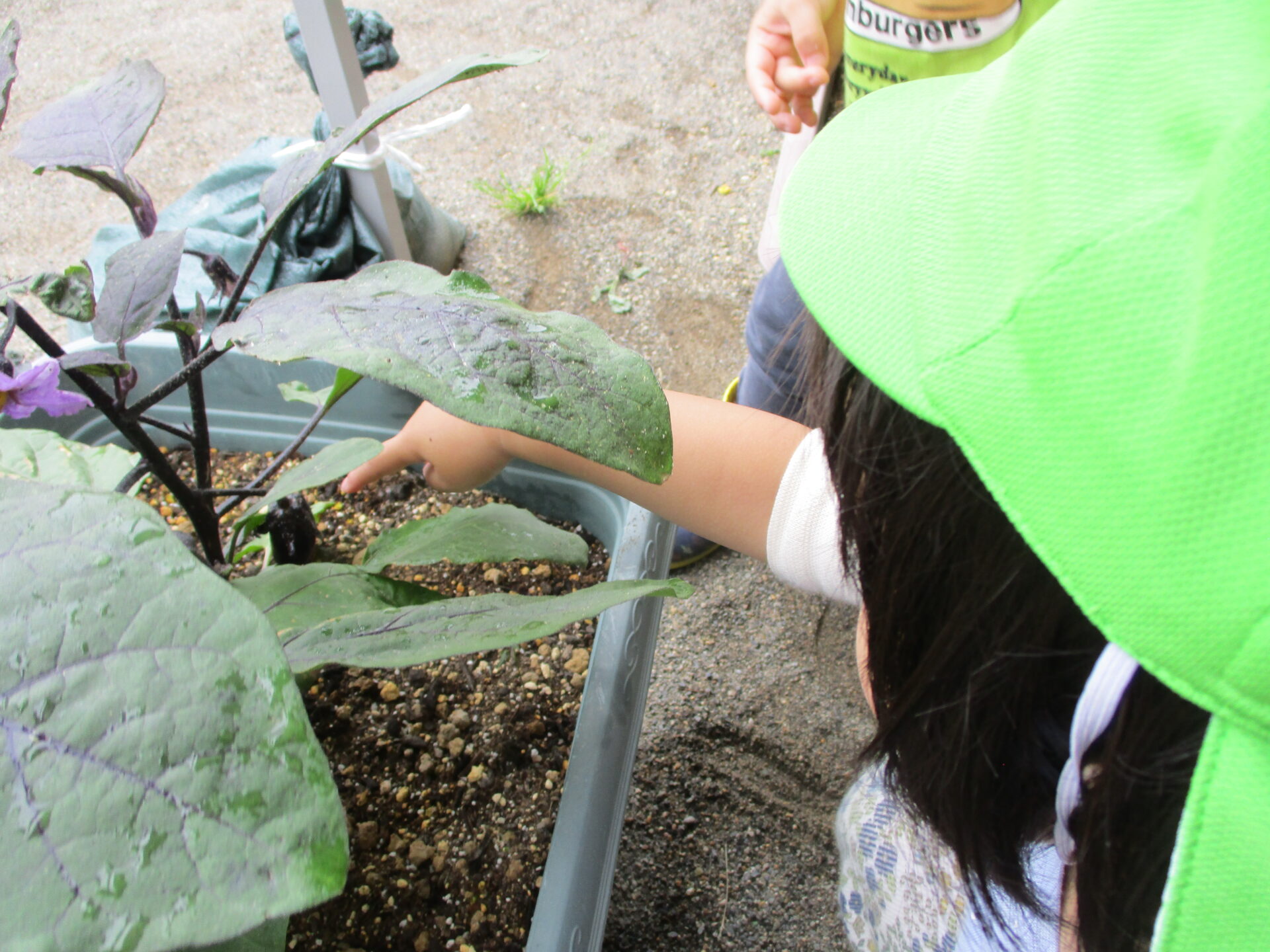 ・毎日ナスを見る中で葉っぱが垂れていることを発見。保育士に「(ナスが)元気ない」と教えてくれました。