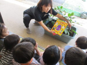 大好きな絵本を通してナスに興味を持った子ども達。実際に育てることでナスが苗からできること、土や水が必要なことを知ることができました。
