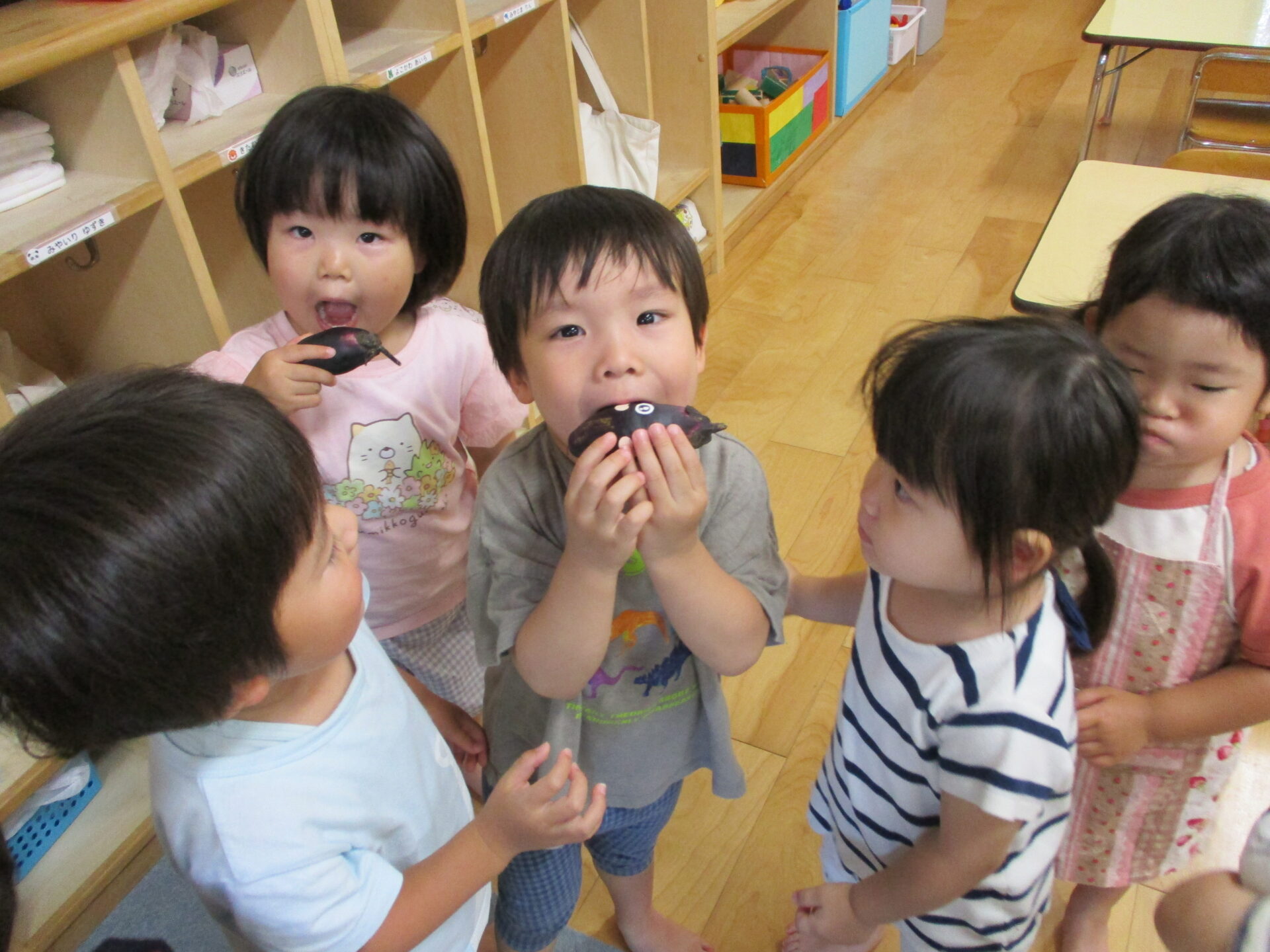 ナスが嫌いな子が多かったのですが、給食に出てくるナスを見つけると必ず「なすちゃん」と言っている姿を見て、今回の活動で子ども達がとってもナスに親しみを持つことができ、ナスのことがとっても好きになったと感じました。