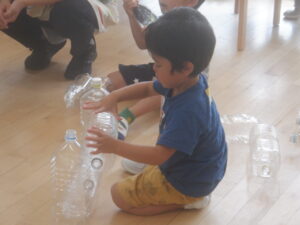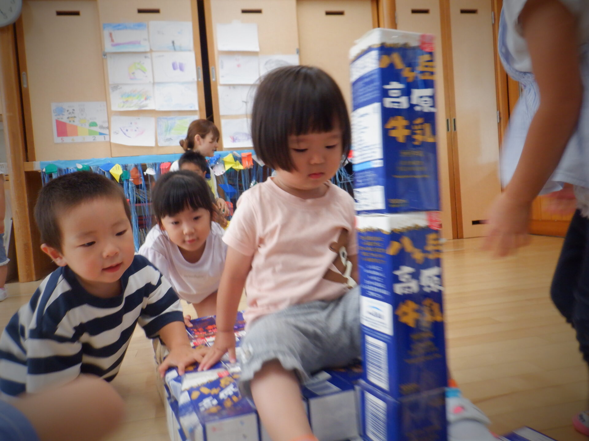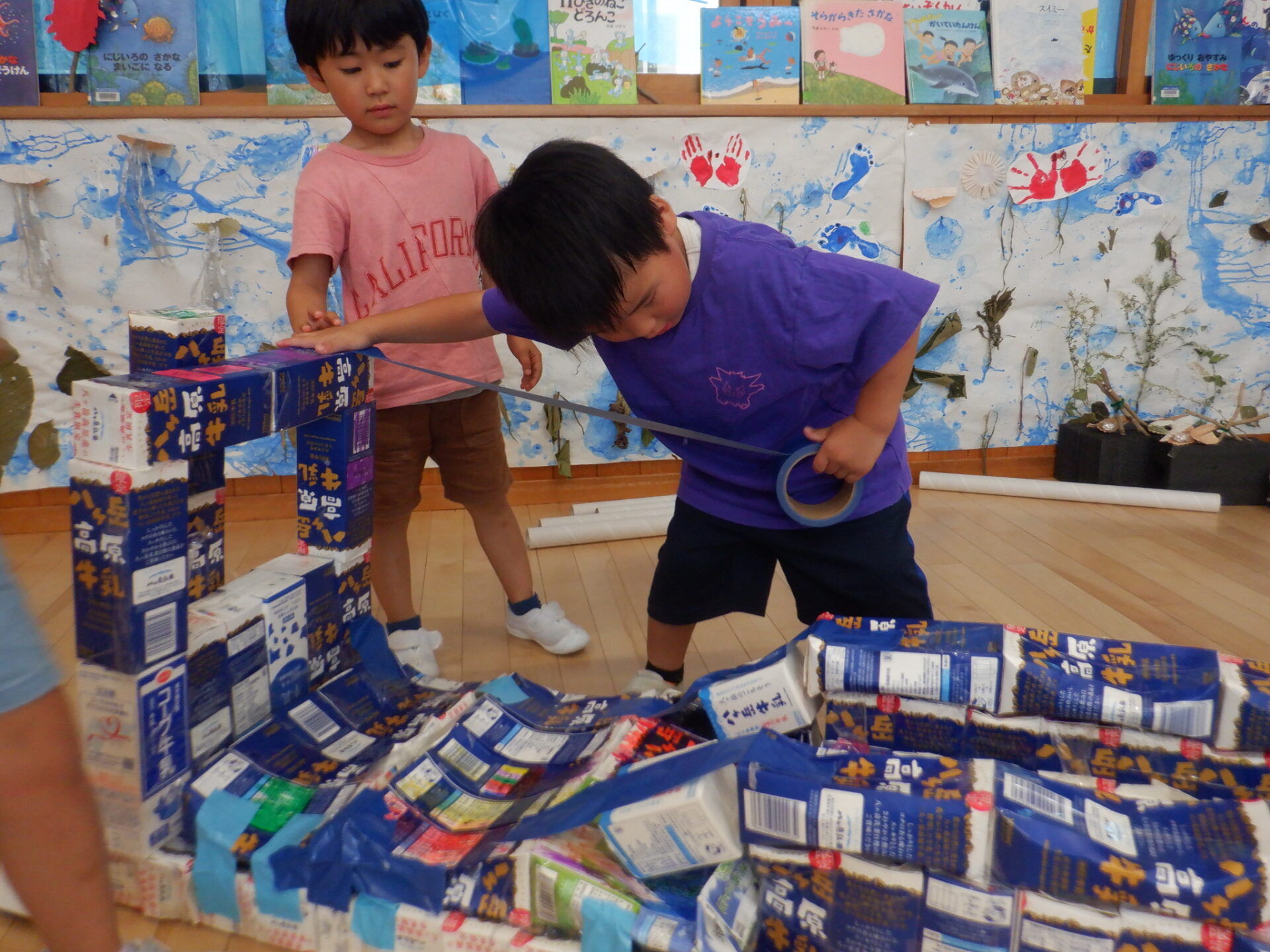 遊びが広がってくると、「今度は◯◯作ろうよ」「〇〇が必要だよ」とどんどんイメージが膨らんできました。作りたいものはあるけど、どうやってやればいいのだろう・・・と悩む子の姿もありましたが、こういうときこそ、ひまわり組23人の知恵を出し合うとき!!みんなで考えて、たくさんのアイデアが生まれました。