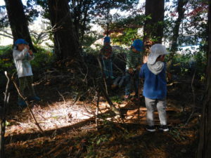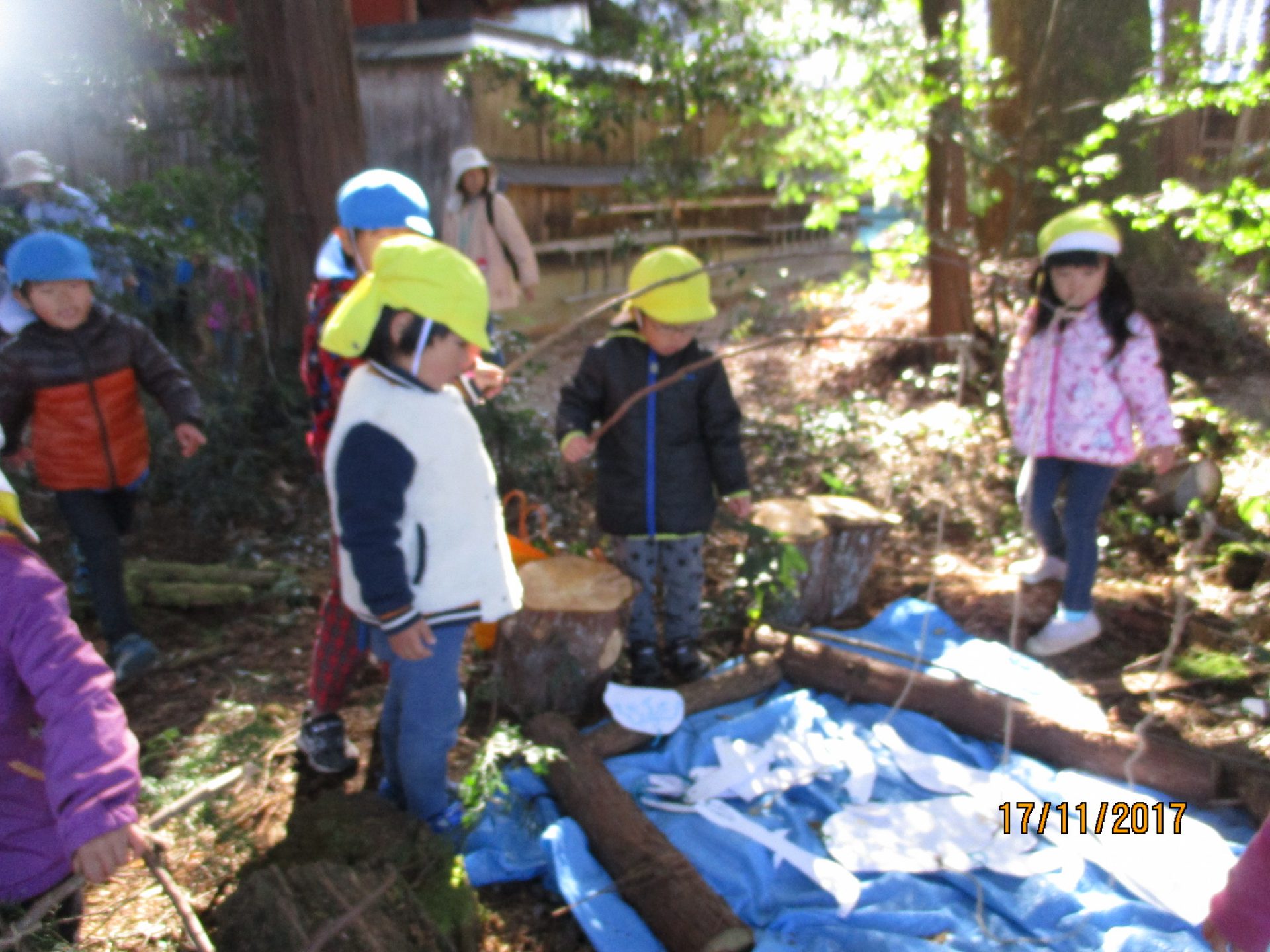 身近な場所にある神社ということもあり、すぐに出掛けながら作って遊んでいきました。自然の中で、どのように遊びを選び、作っていくか、様々な物を見立てながら工夫して遊ぶ楽しさを感じました。