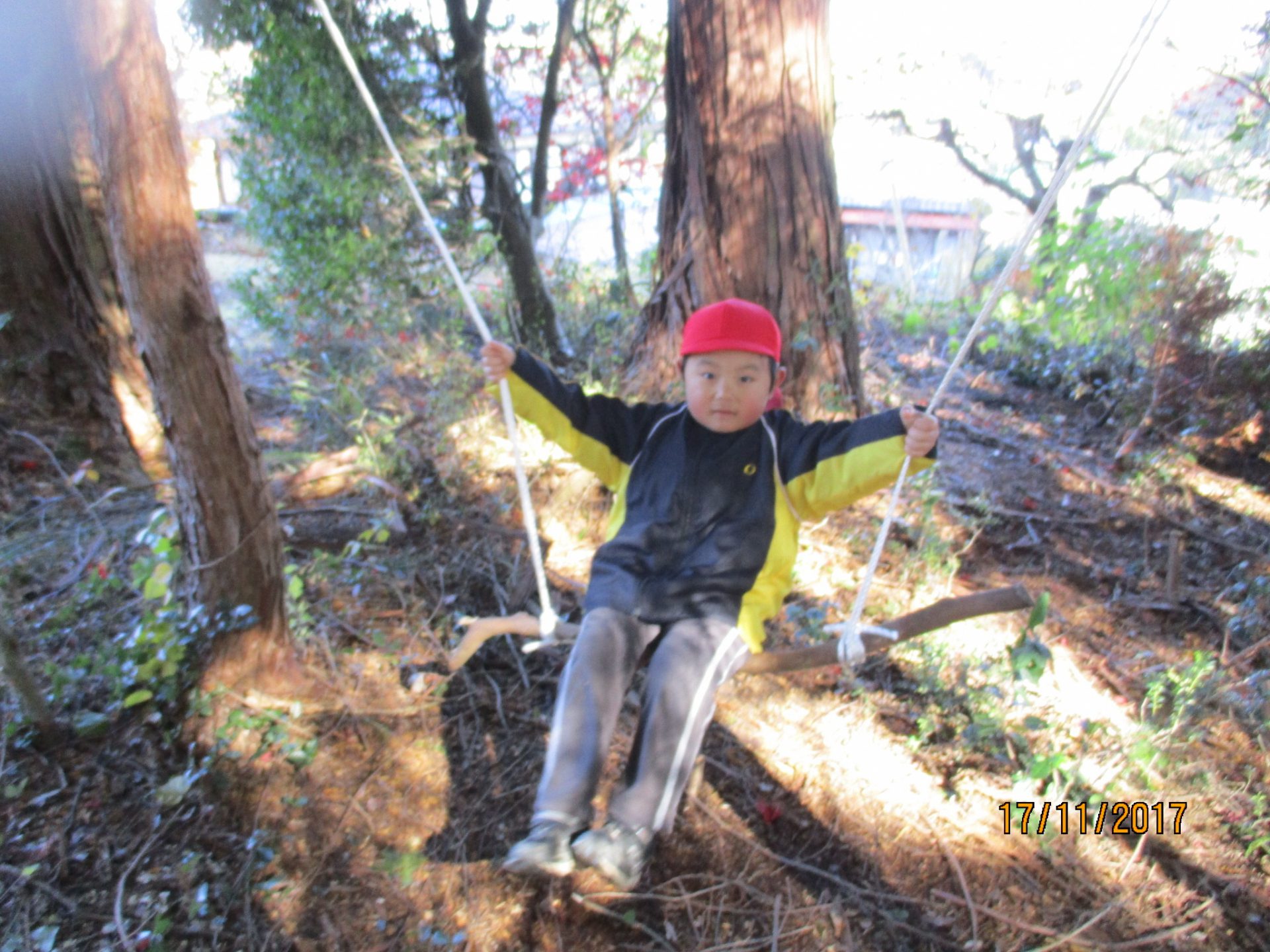 手作りブランコ。バランスよく乗らないといけません。「たのしー!!」と大喜びで乗っていました。