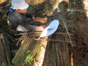 保育園の近くにある中村神社に出掛け、大きな木に立てかかっていた枝を見て「なんか家みたい!」と発見。近くに落ちている枝を集めながら、地面に刺していき、木の家を作っていきました。「もっとここに持ってきて!」「その枝はここに刺そう!」と、友達を誘いながら作っていきました。