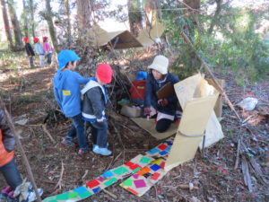 数日、通いながら作っていく中で、家作りだけではなく、弓矢や魚釣りで遊ぶ子も出てきて、4・5人で集まりながら作っていきました。作った家の中に入って「気持ちいい!ぞうのまちに小さい子も呼んであげたい!」という声が上がり、招待して遊んでもらいました。