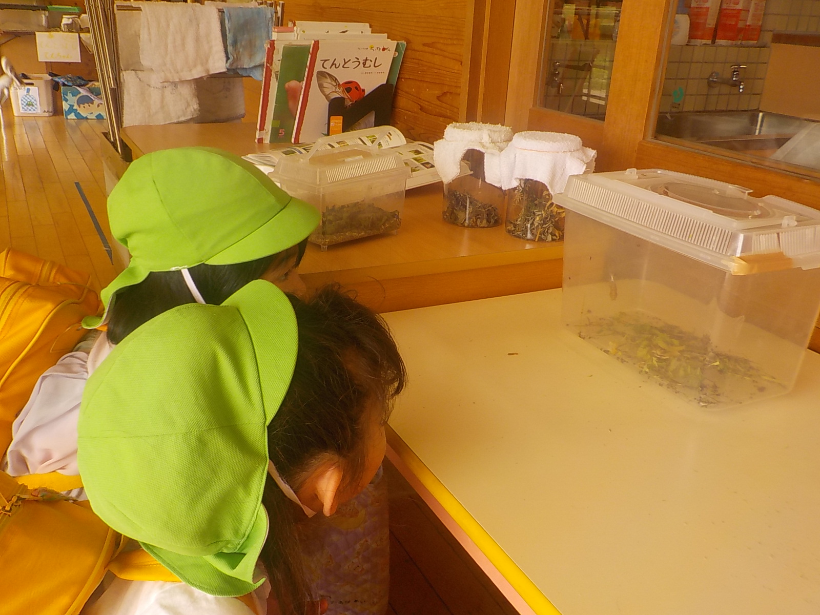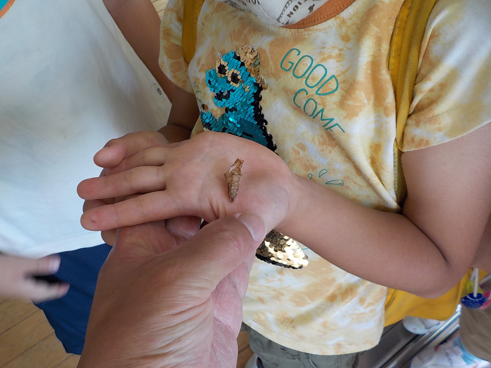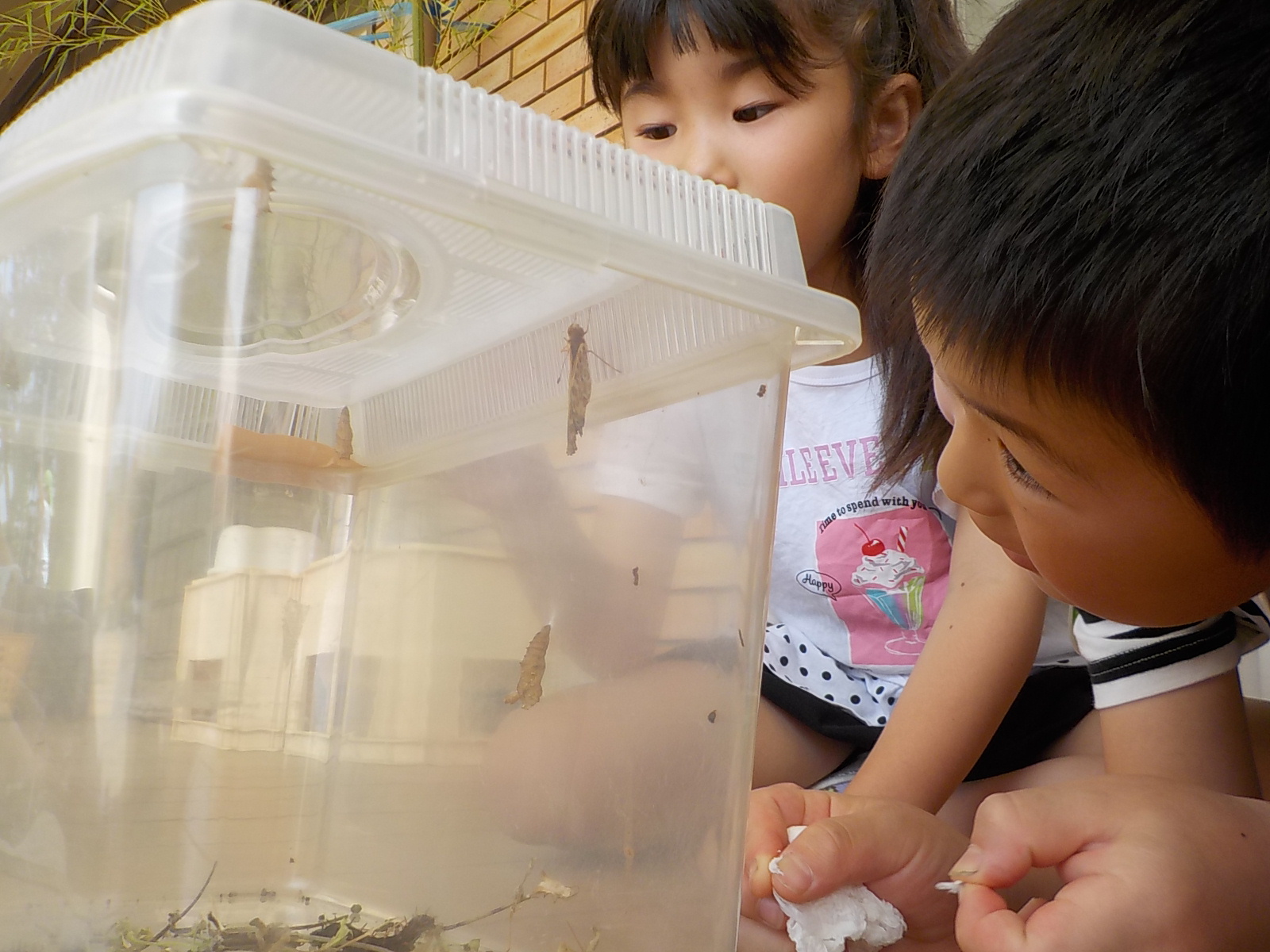 「さなぎになった!」「なんかキラキラしているところがあるよ!」「なんでキラキラしてるんだろう!?」夢中になって見ていました。