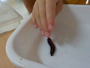 幼虫に触れてみる子どもたち。「チクチクしてない!ぷにぷにして気持ちいいよ!」「なんだかくすぐったい!」