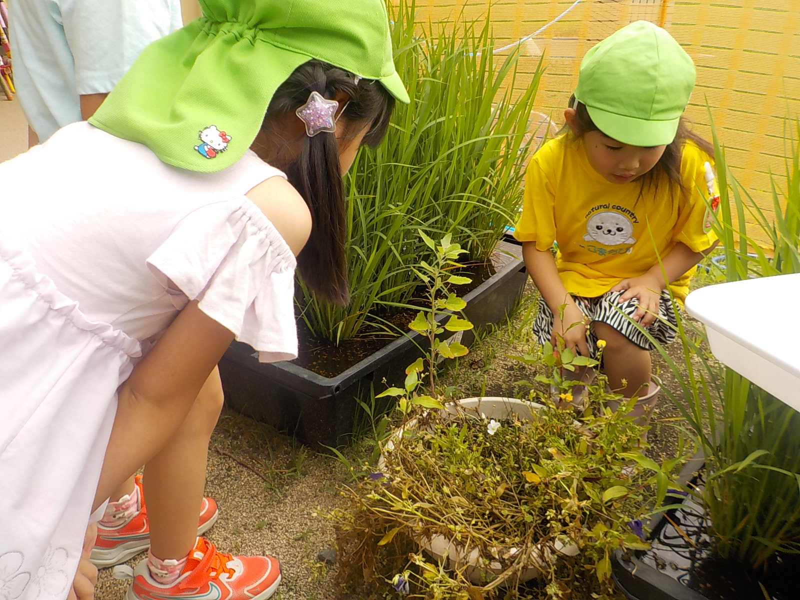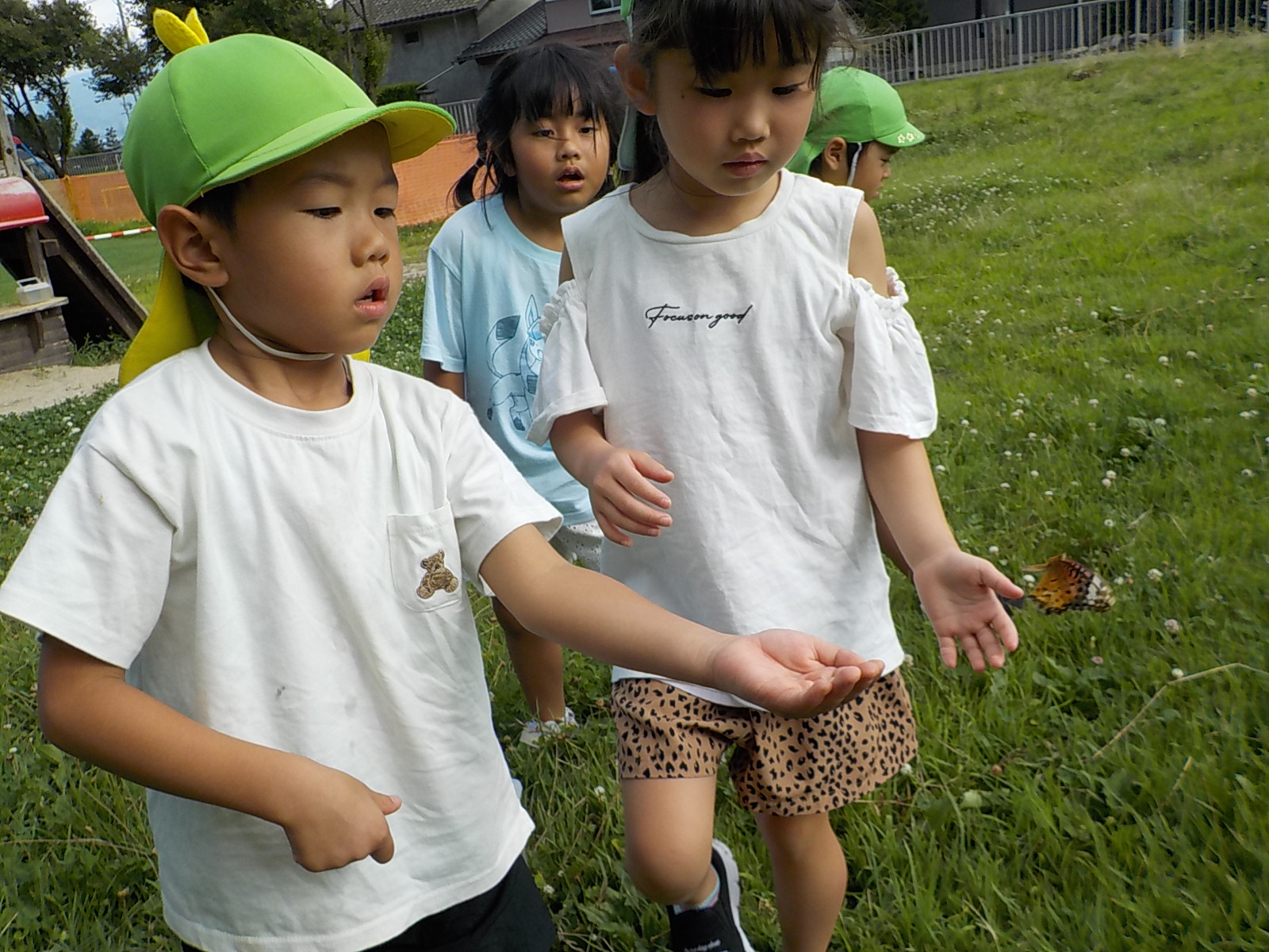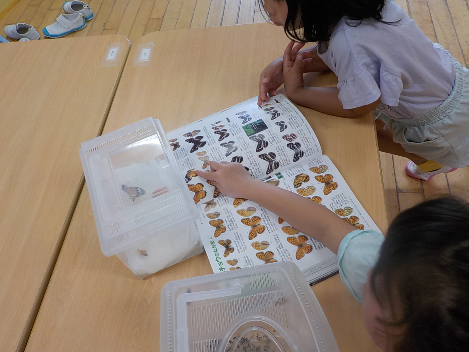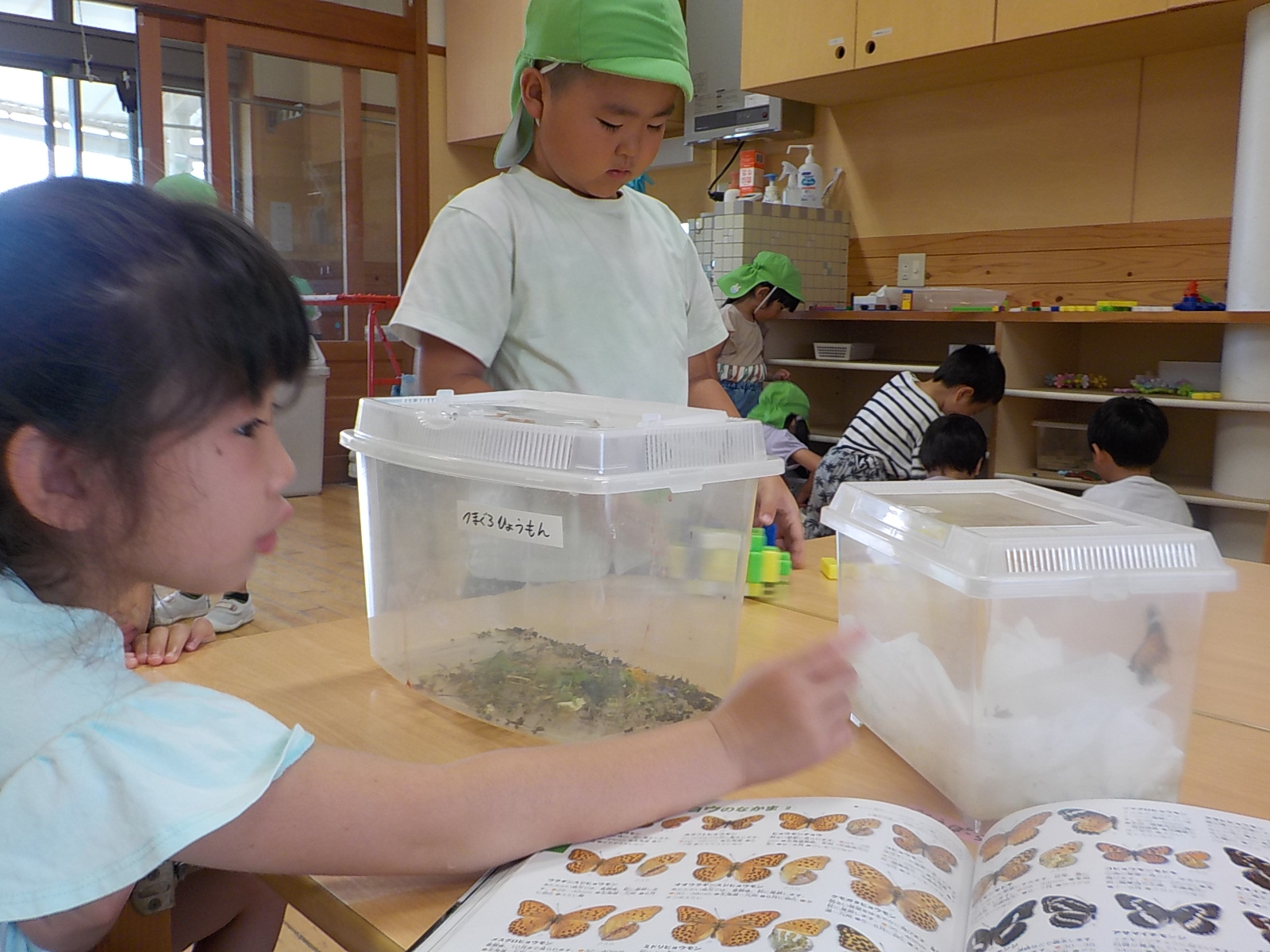 「ちょうちょが出てきたよ!」「本当だ!!」みんな食い入るようにかごの中を覗き込んでいました。