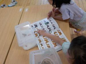 「図鑑と一緒だ!」図鑑と見比べてみる子どもたち。保育士がオスとメスで模様が違うことを知らせると、「この子はメスだね」と気づいていました。