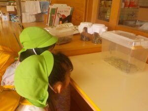 「この子がお父さんでこの子が赤ちゃんかな?」幼虫の大きさから想像して楽しむ子どもたち。