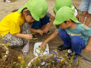 クラスの前にあるパンジーに幼虫がついていることに気づいた子どもたち。