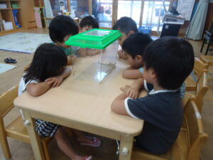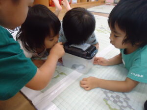 虫カゴに入れ、みんなで形や色、動きなどを観察。