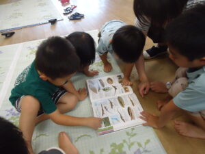 「体がきらきら光っているよ!」「模様がこれに似ているよ!」と、図鑑を出して真剣な顔で見比べています。