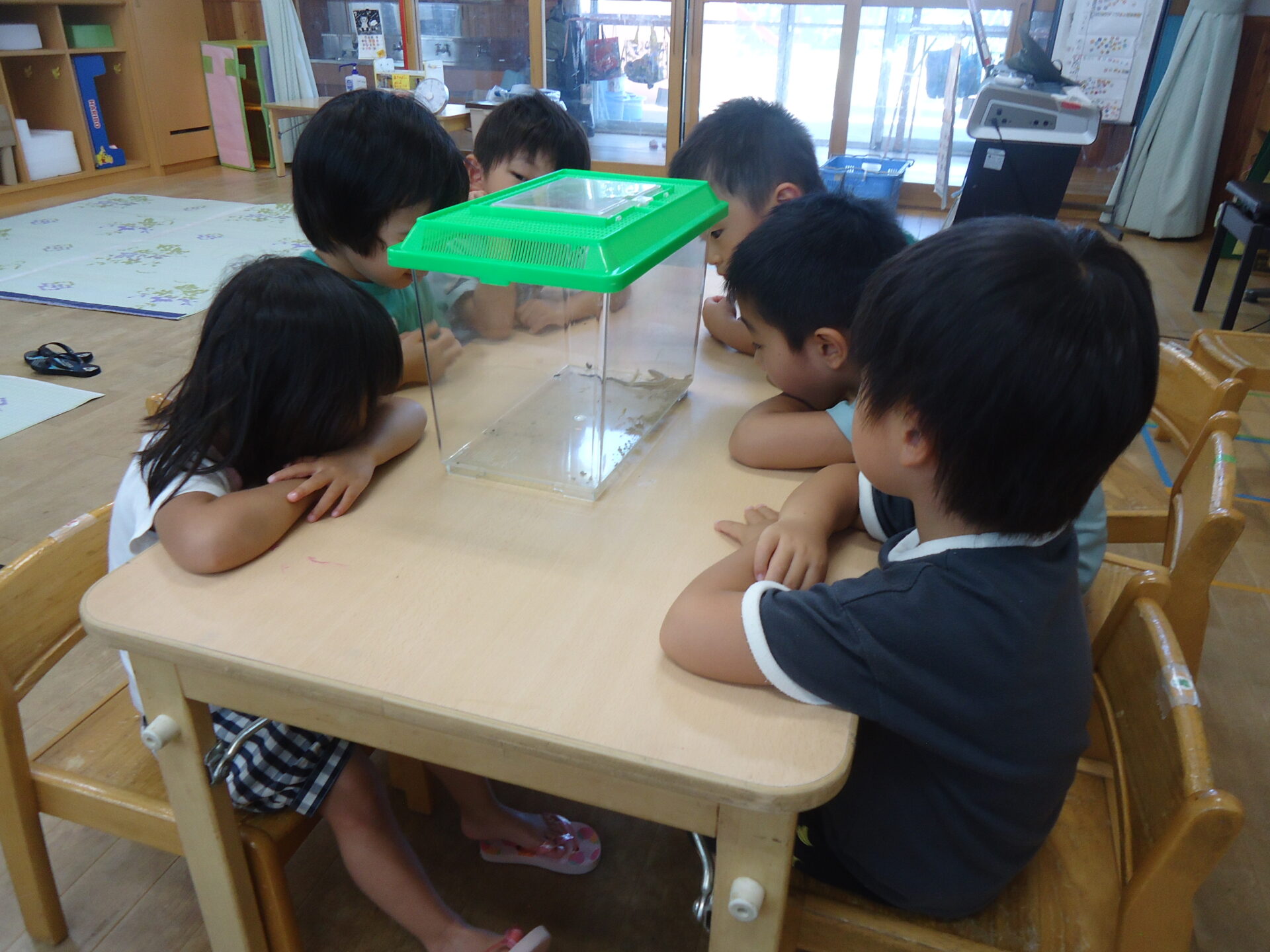 「いっぱいになったねー」「何匹いるかな?」「これは僕が捕まえたダンゴムシだよ!」とエサとなる生き物にも興味津々です。