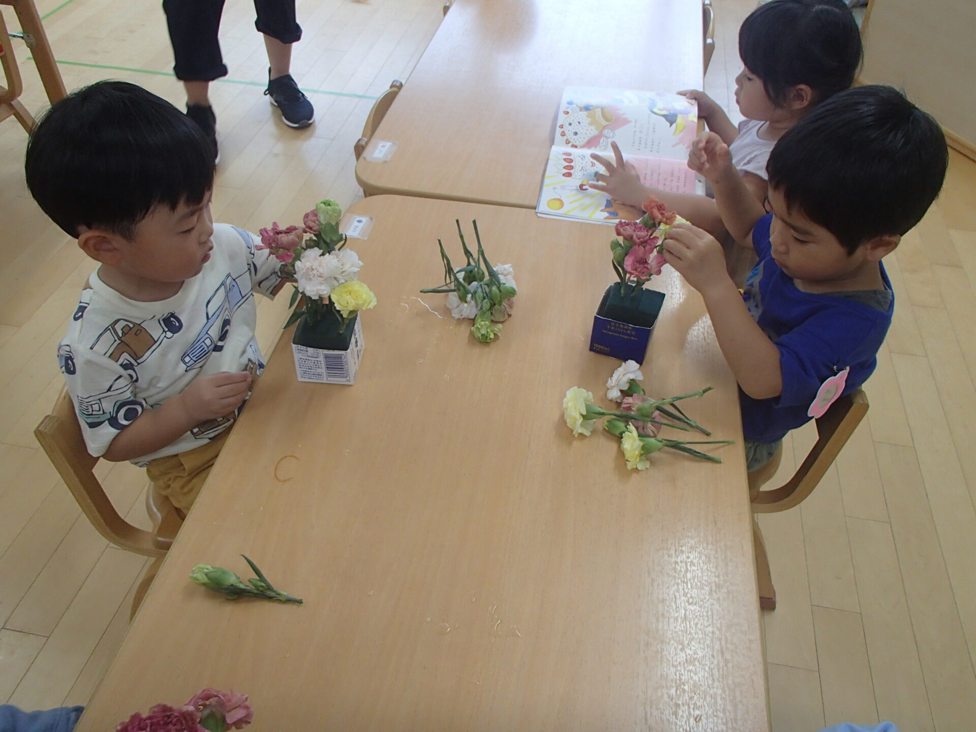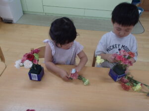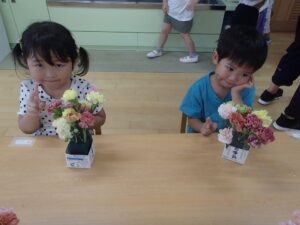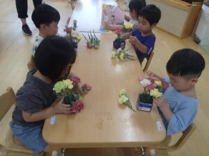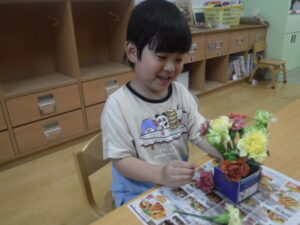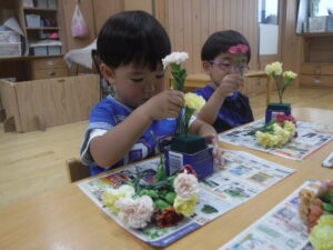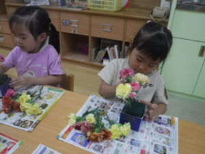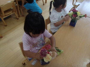 「ここにお花を挿してみよう」各自がイメージをもって楽しんでいました。
