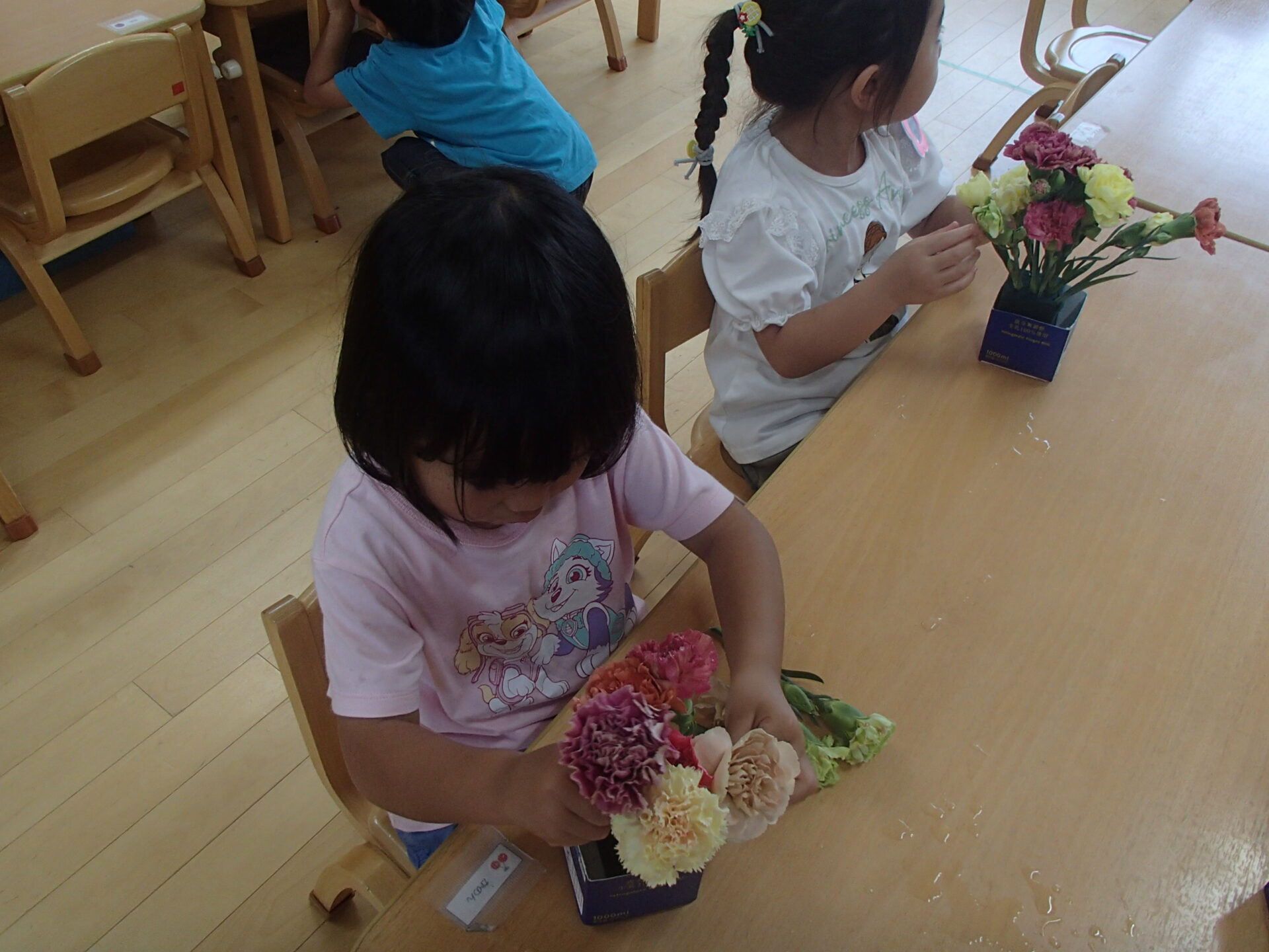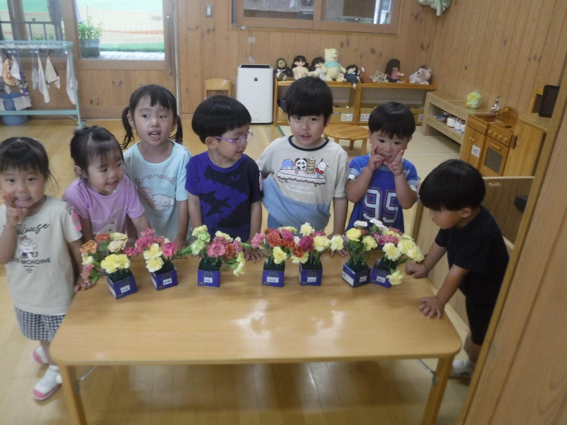 たくさんのカーネーションに興味をもち、期待いっぱいの子ども達です。