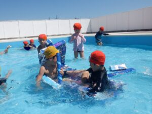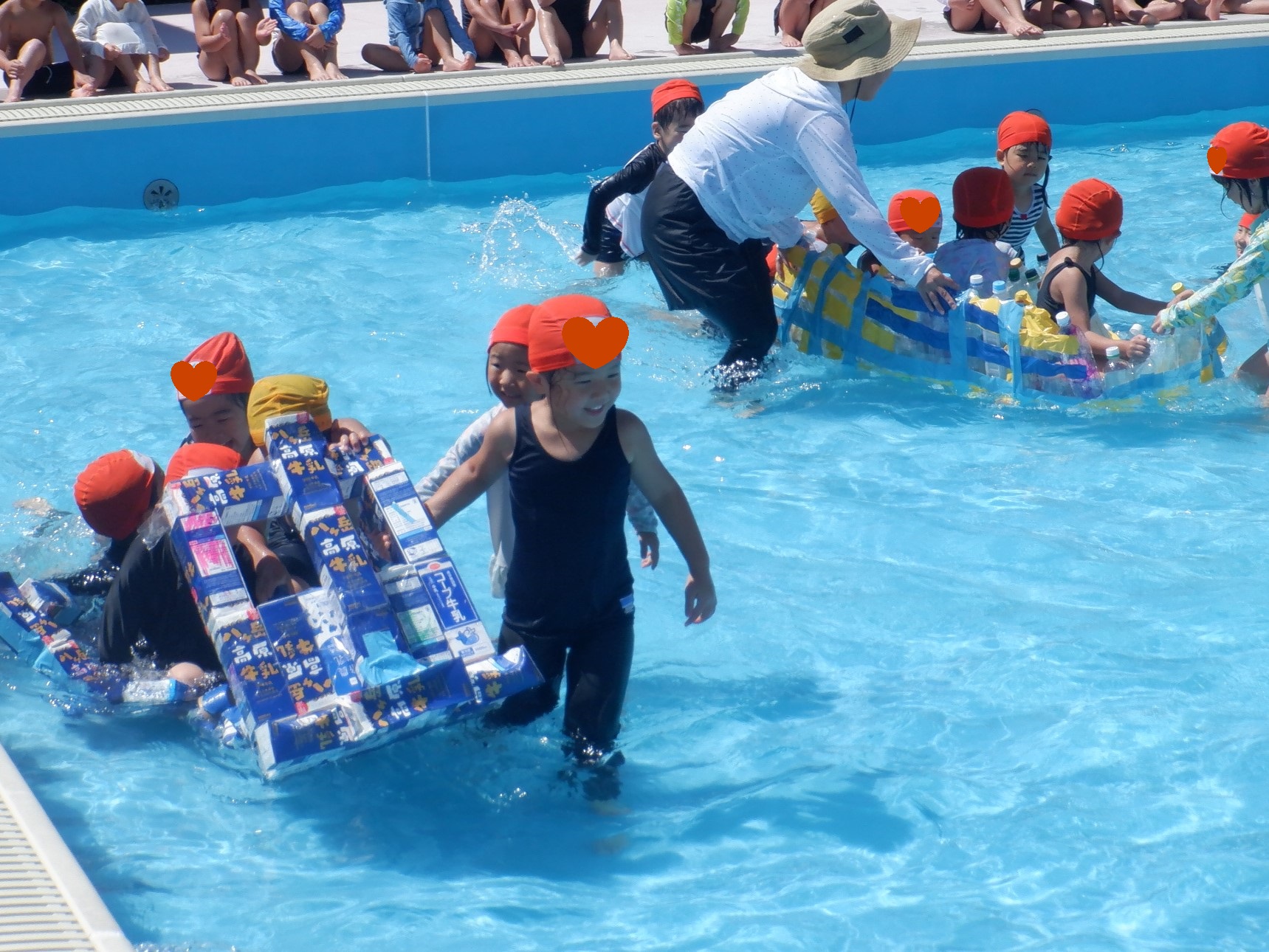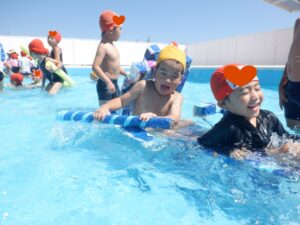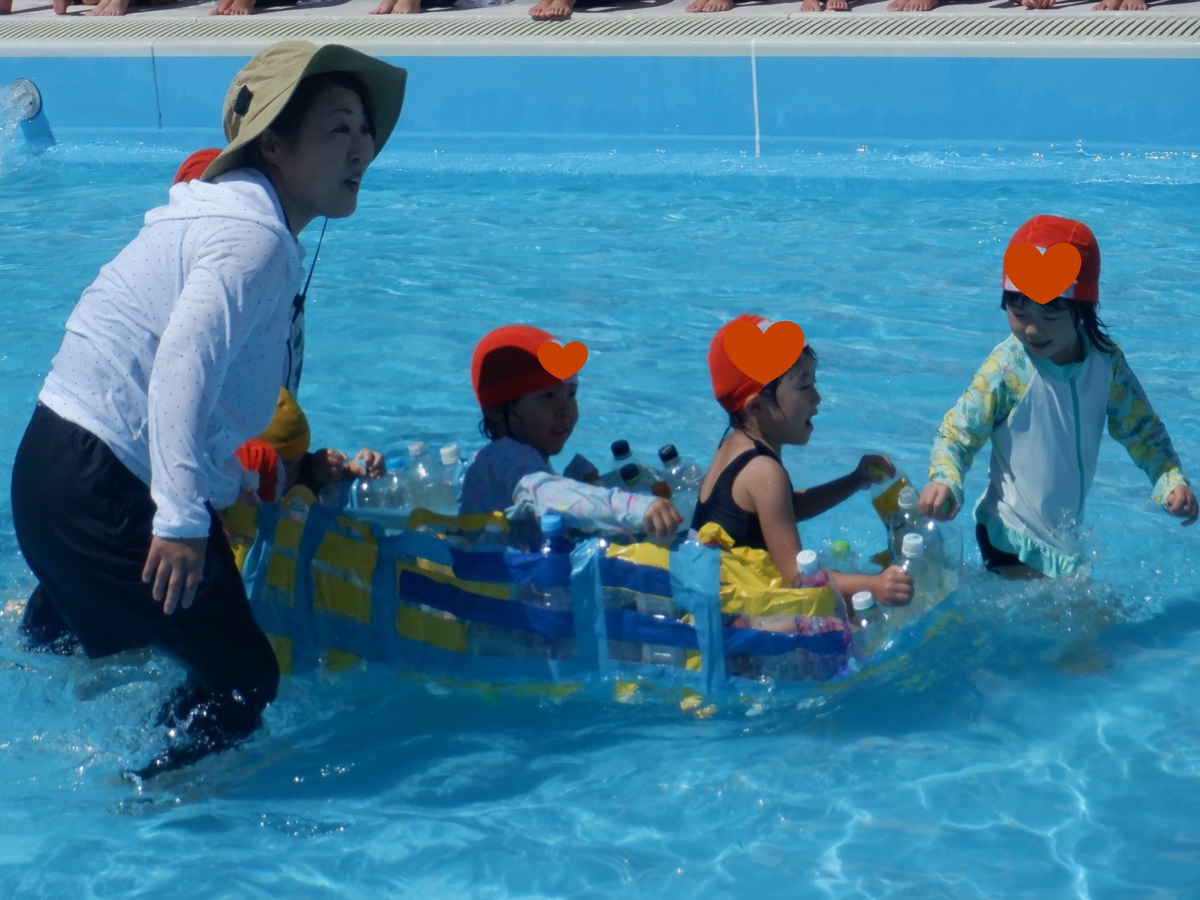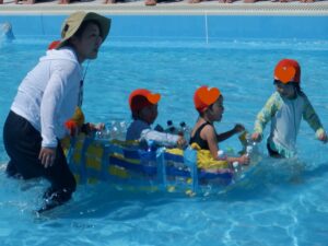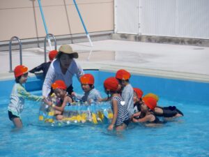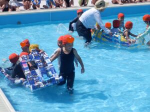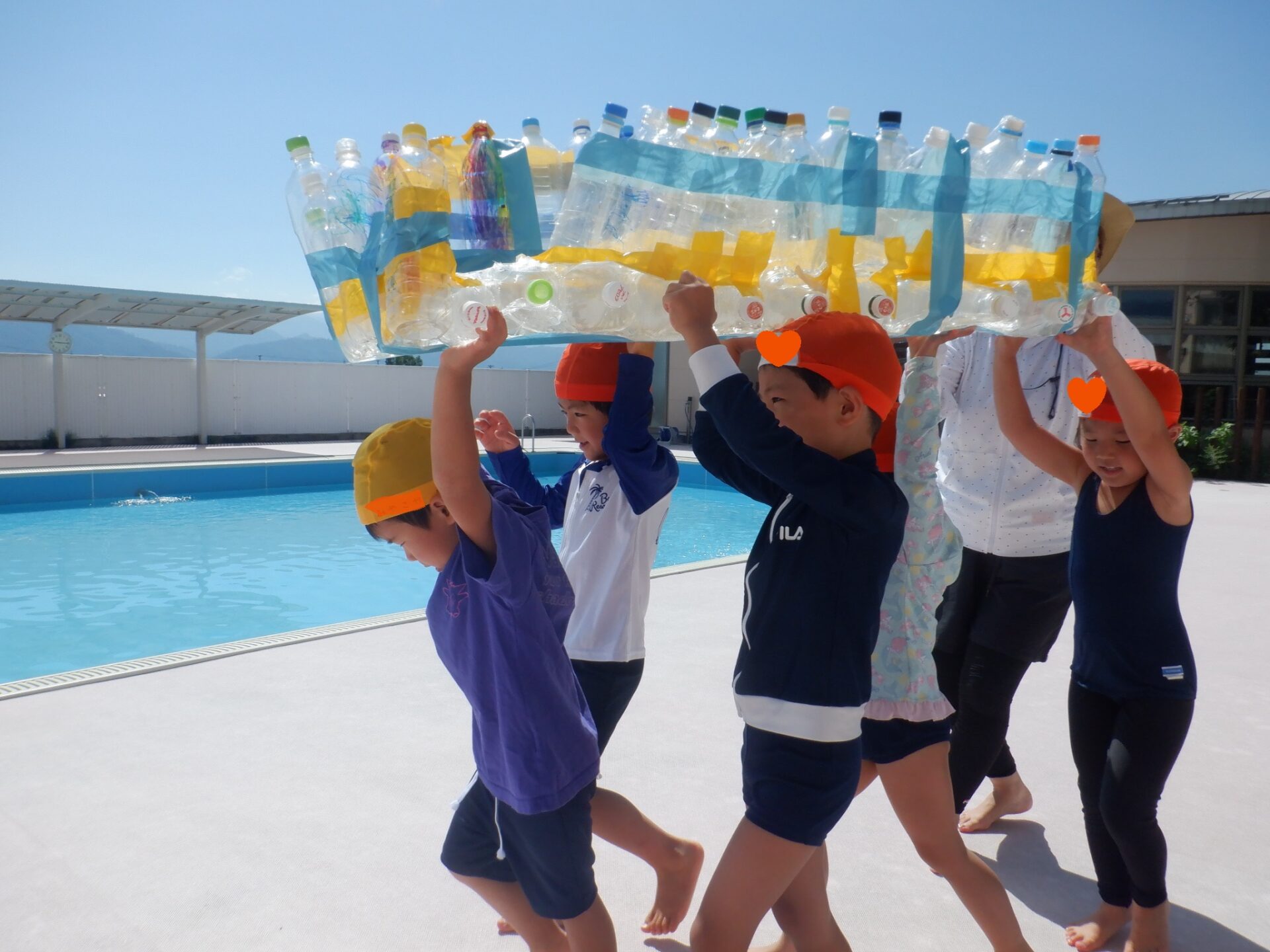 ペットボトルは子どもたちの予想通り、プールの中でもしっかり浮かんでくれました。