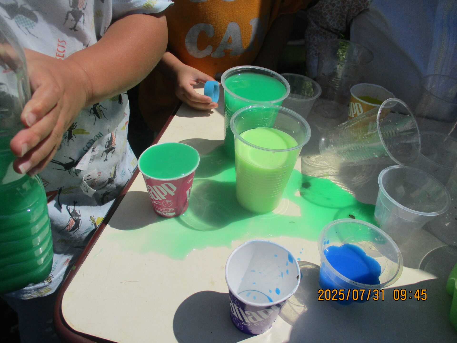 絵具を使ってジュースを作りジュースやさん。「はい!どうぞ~!」とごちそうしてくれます!