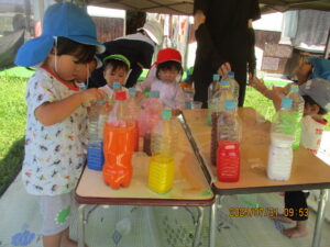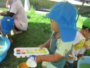 色を覚え始めている未満児さんにとって、色が変わるのは不思議!僕の好きな赤だったのに…ショボンとしている子もいました。でもそれも経験する中で色の名前を覚えたり、楽しいな~と感じる経験になってほしいです。