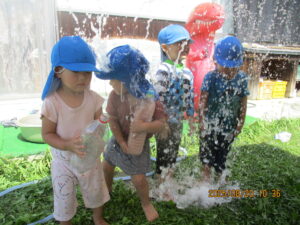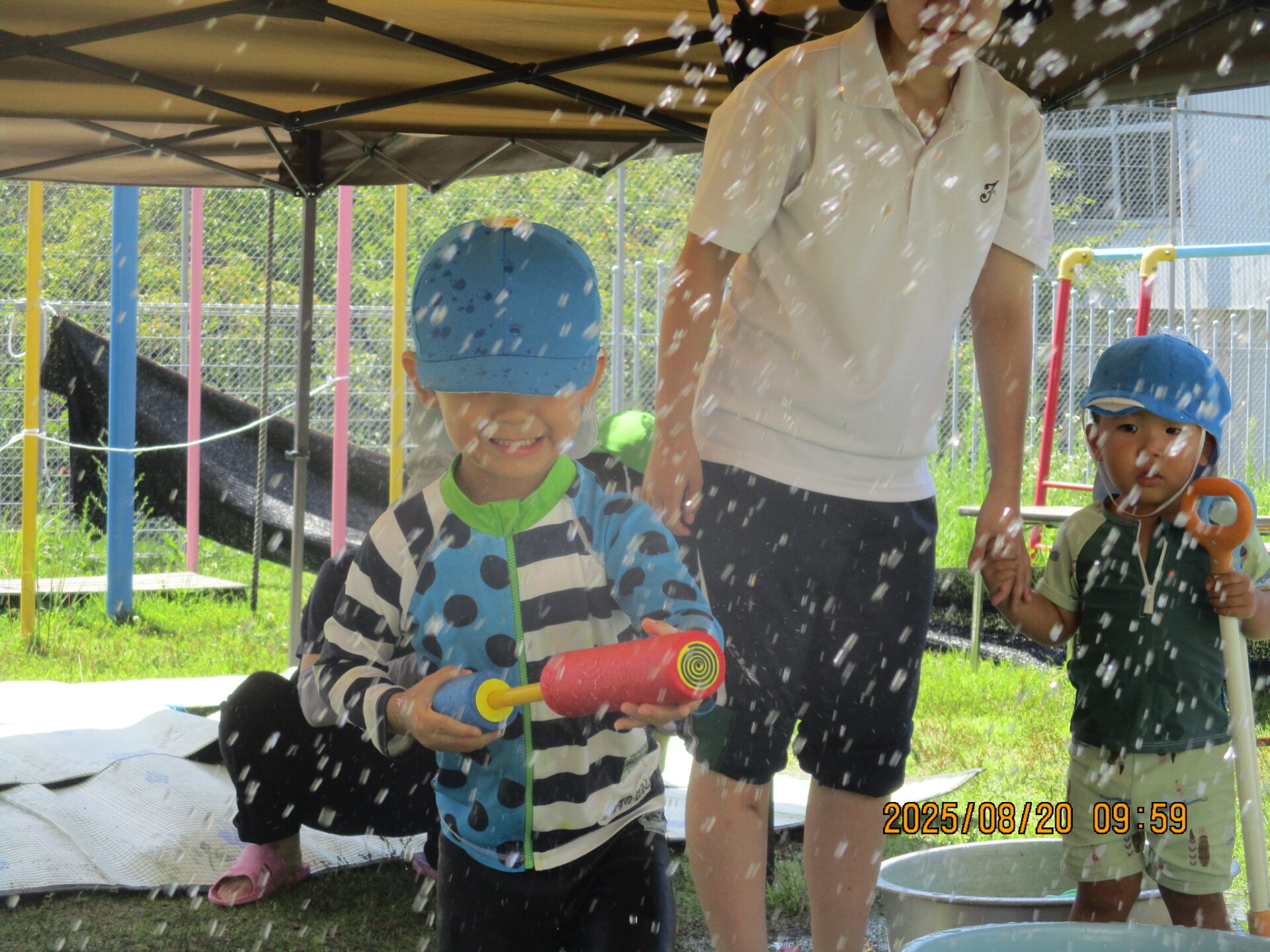 暑い日が続き、テントの屋根から滝のように水を落としたり、水鉄砲で友だちや保育士に水をかけて楽しんでいます。