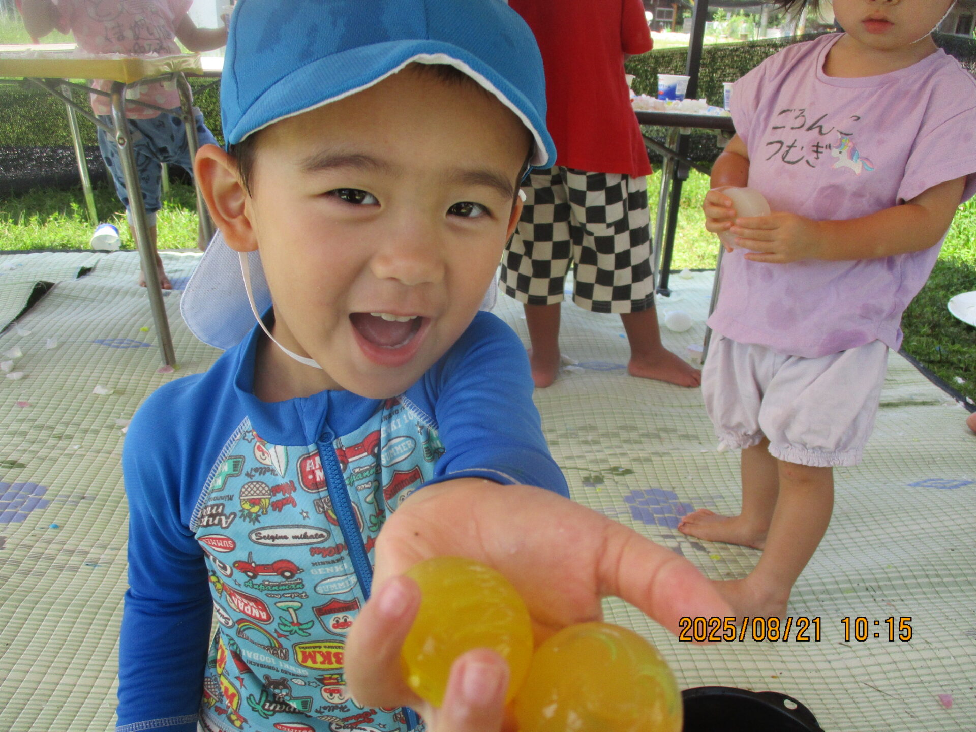 寒天を触って「かたいねー!つぶれちゃった!」「こおりじゃない」