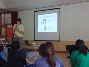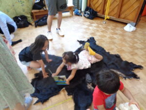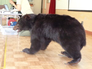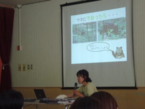 西箕輪南部保育園がある地域は、山裾にあります。クマと人間がそれぞれの場所で安心して暮らせるように、クマのことをもっと知ろう!ということで、6月の参観日に『信州ツキノワグマ研究会』の瀧井暁子先生に来ていただき、親子でクマについてお話を聞きました。