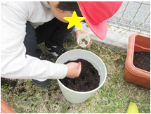 ・給食で出た果物の種を見つけ、埋めてみようと考えながら興味を広げていく姿はとても可愛くてつい見守ってしまいました。いくら待っても芽が出ない、どうするかと思いきや、「次はこうしてみよう」「こうしたらいいよね」と前向きに興味をどんどん広げながら様々な発想をする姿を見て嬉しくなりました。