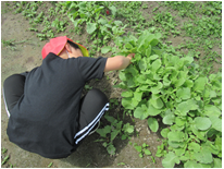 葉っぱをのぞき込みながら、食べたい野菜を選びます。