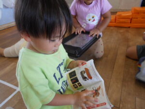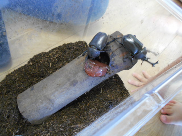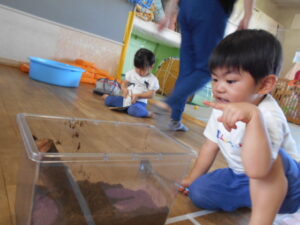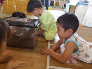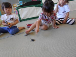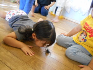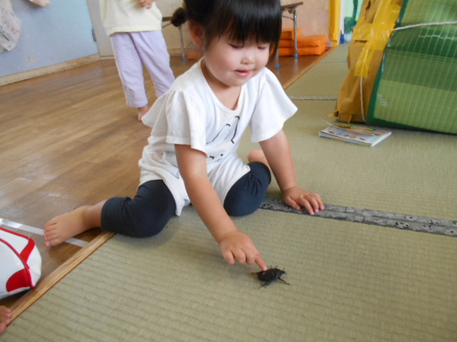 「これ何ー?」「かぶとむし!」「大きい!」とかぶとむしに興味津々の子ども達。
