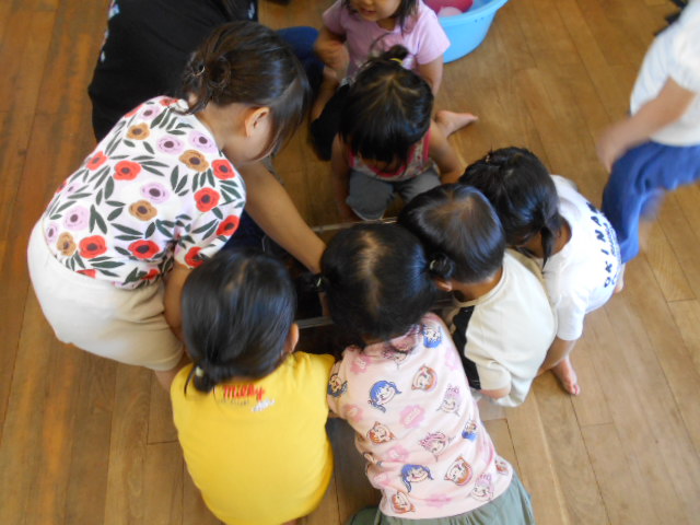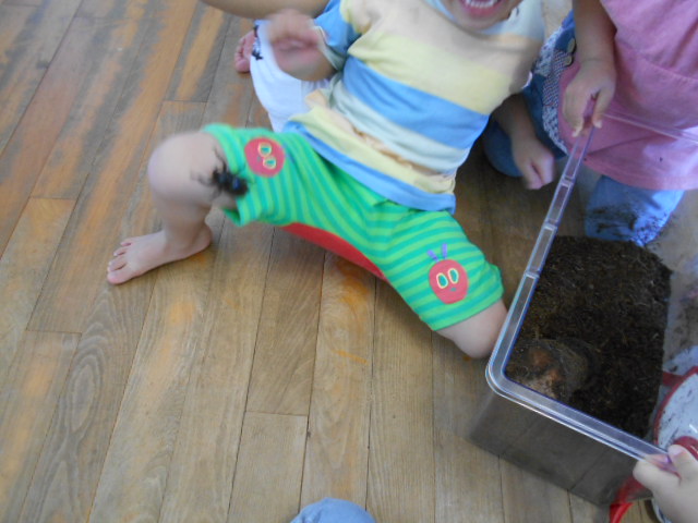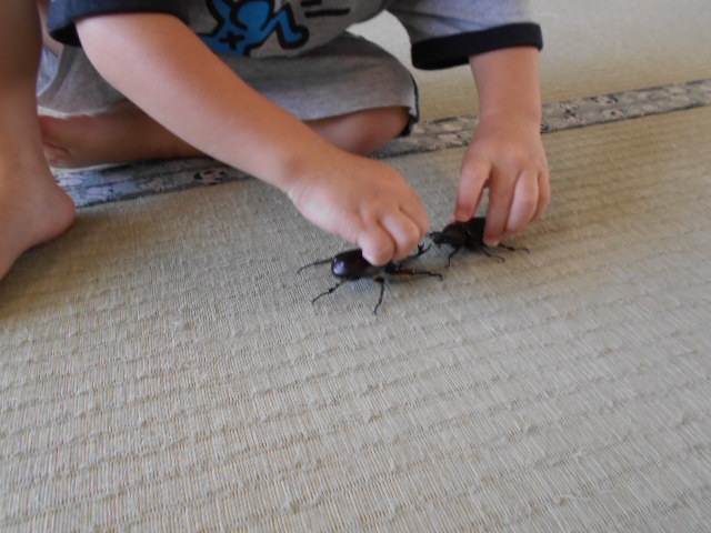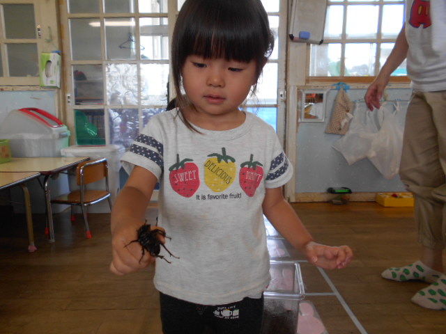 怖がらずに触れる子、ちょっと怖い子・・・反応は様々ですがその子なりにかぶとむしに親しみを持っていました。