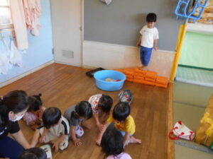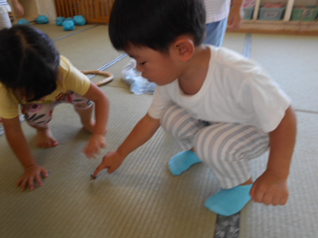 「子ども達に見せたい!」と思い捕まえて室内にいる子ども達のところに持っていきました。すると・・・