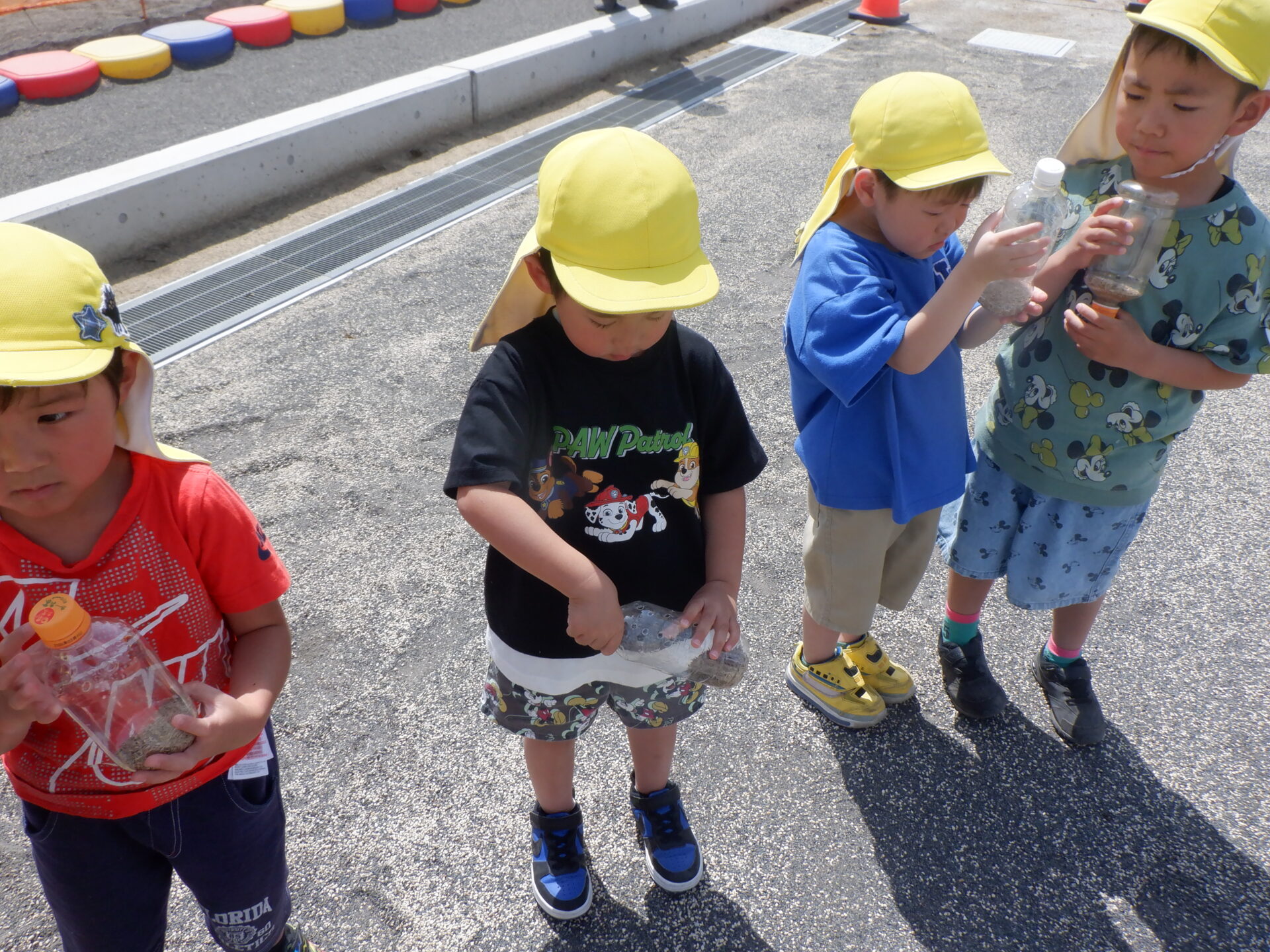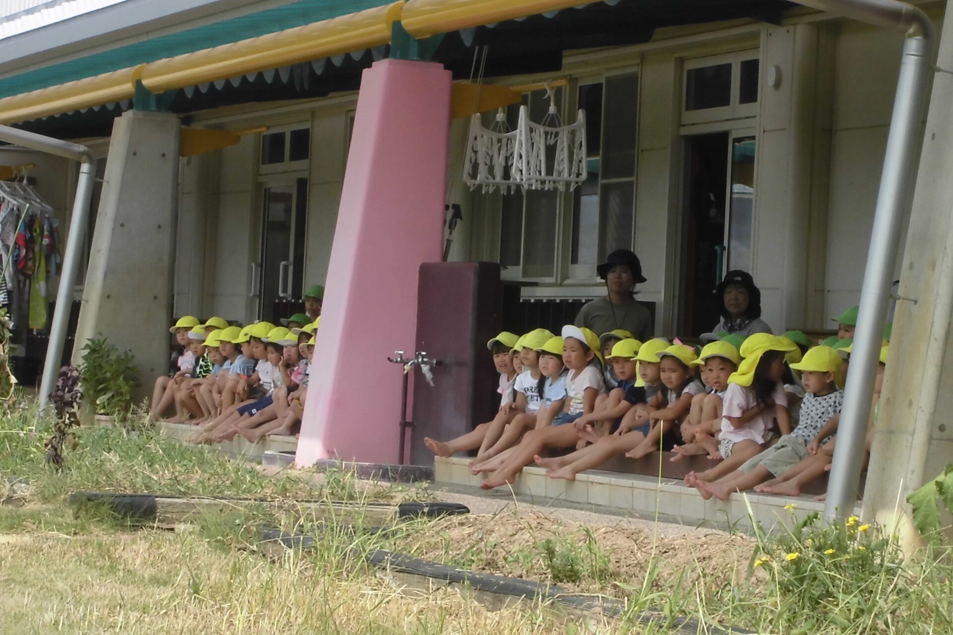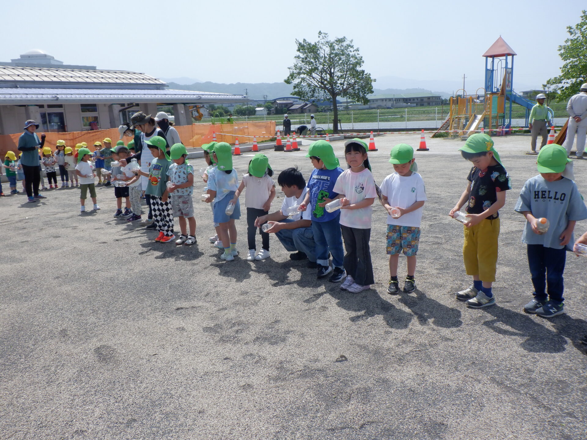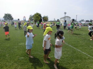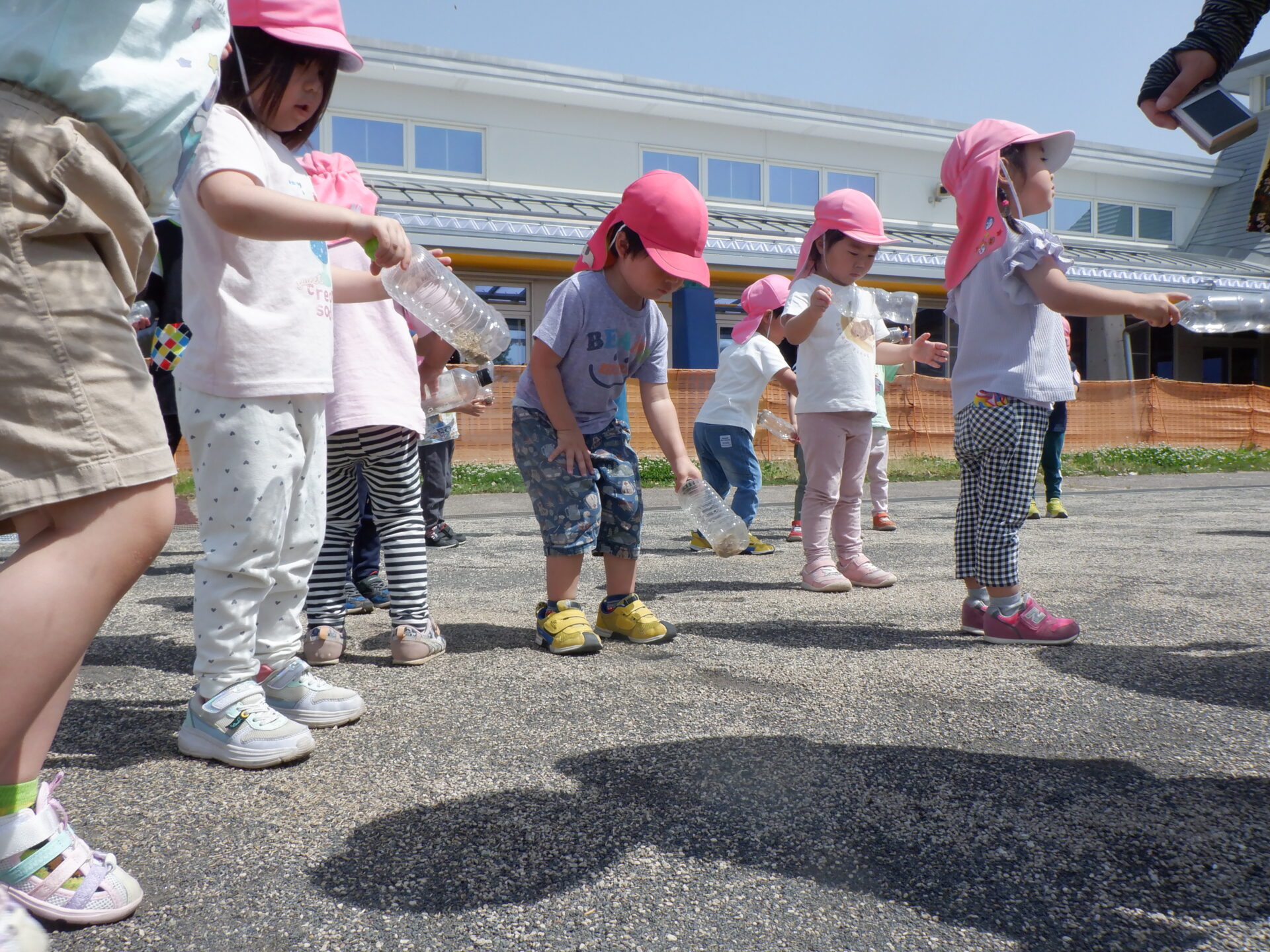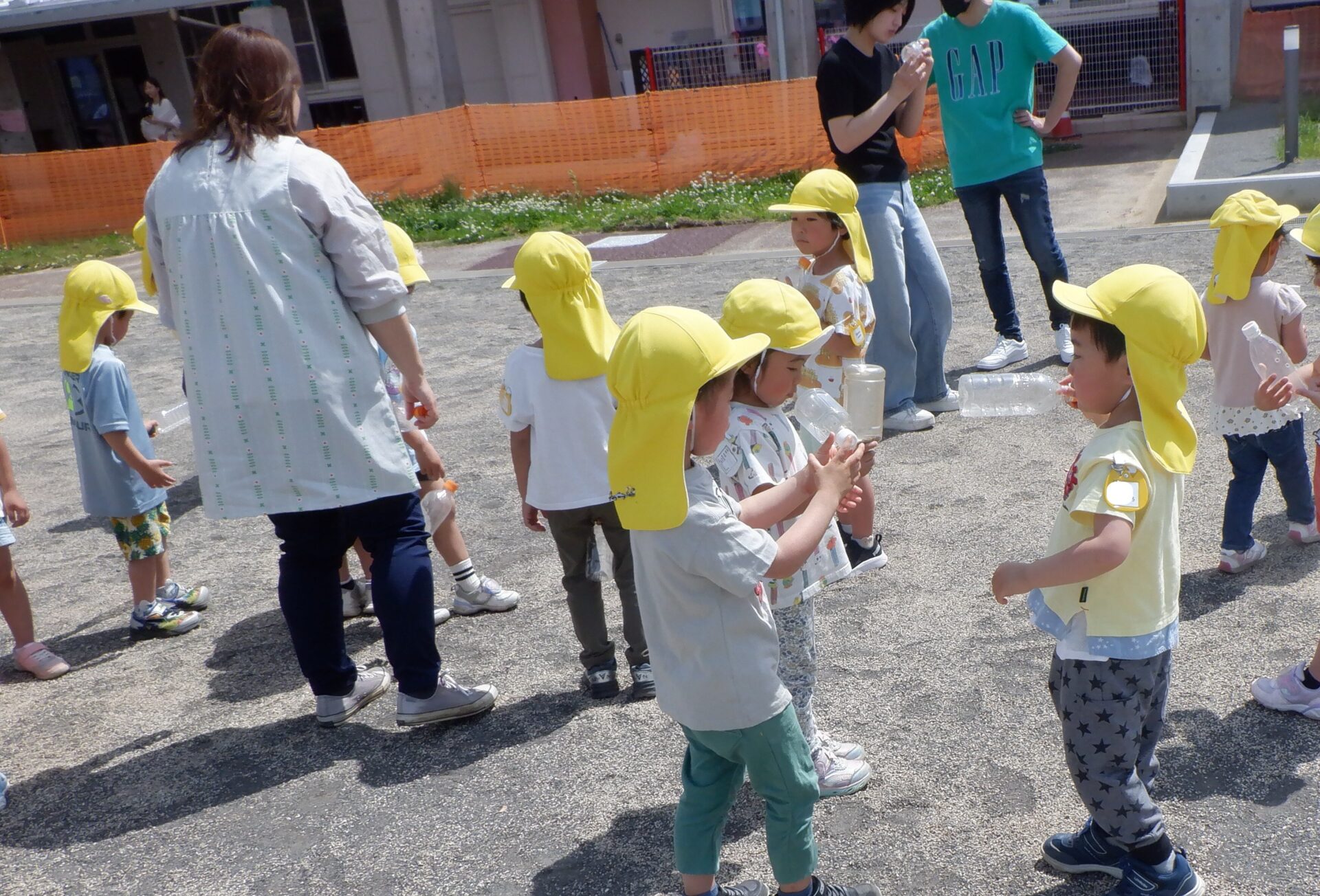 みんなでおやくそくを聞き、園庭を歩いたりスプリンクラーであそんだりしました。