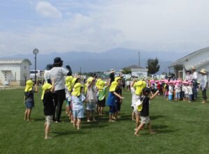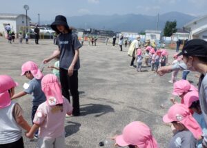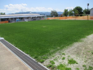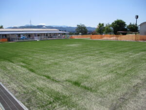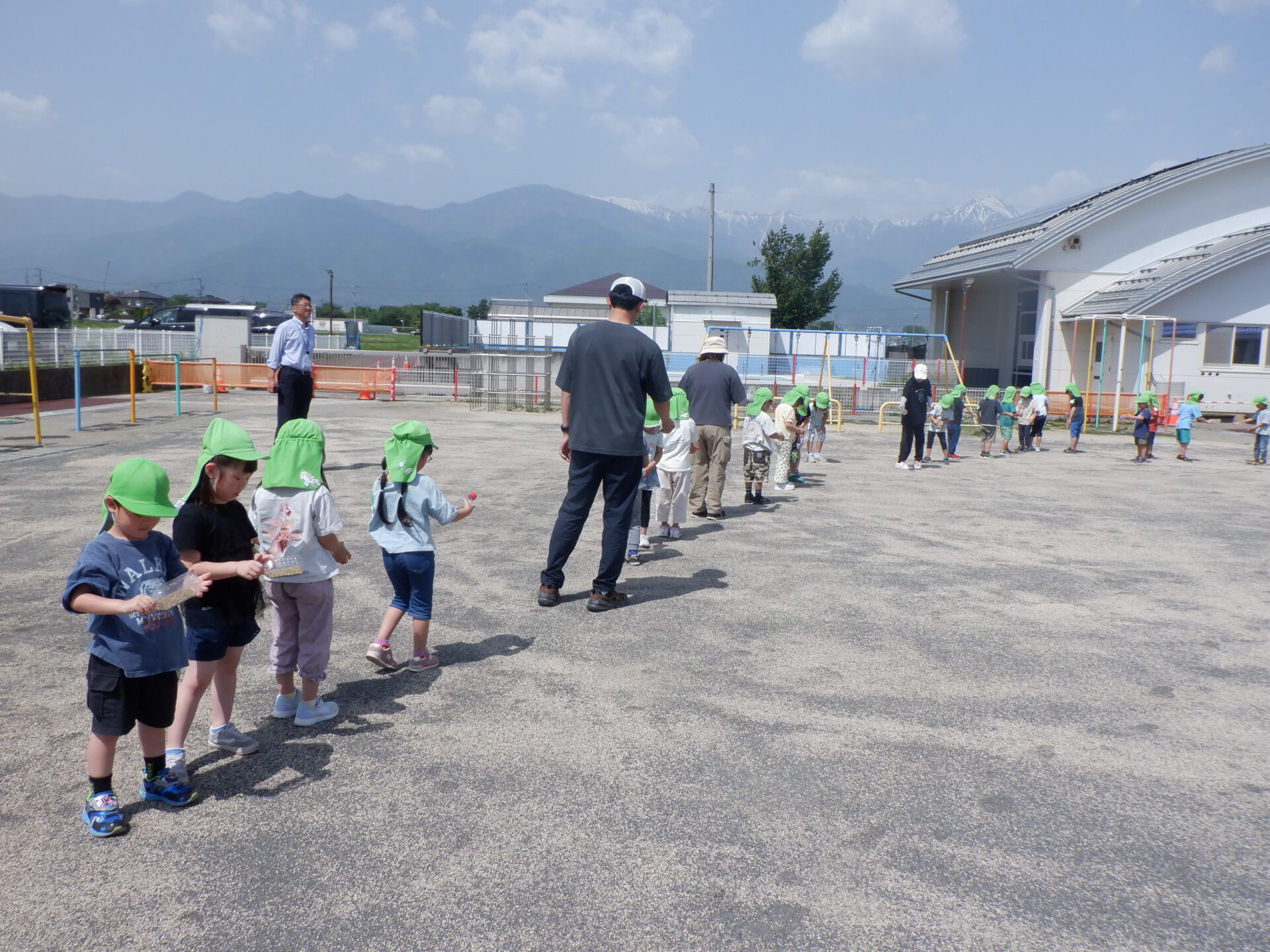 5月、南穂高認定こども園の園庭にみんなで芝生の種まきをしました。