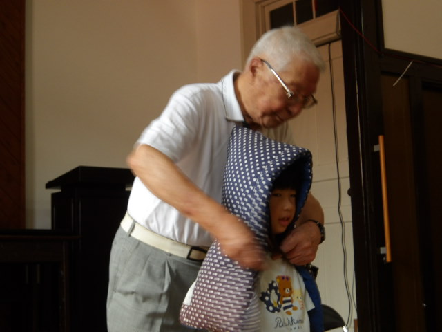 実際の防空頭巾をかぶったり、藁草履を履いてみました。