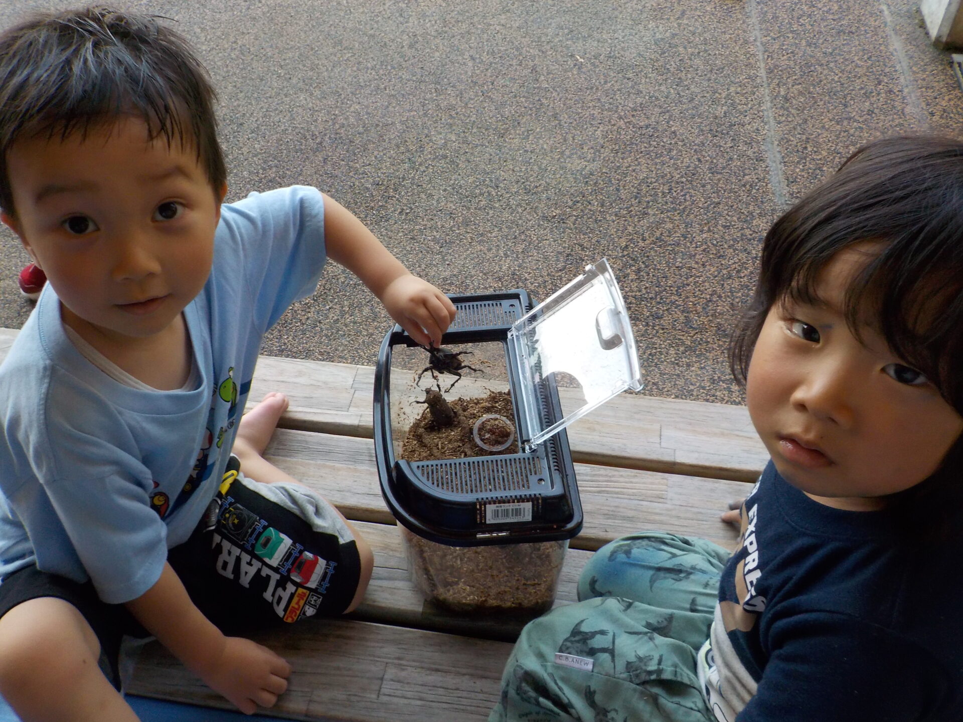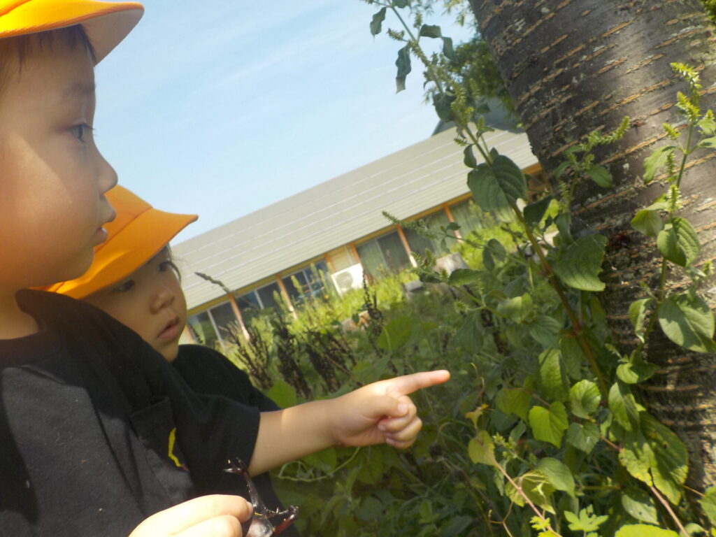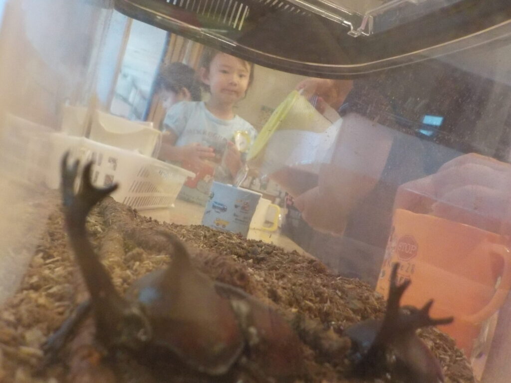 およそ一か月間、私たちとカブトムシの生活は続きました。触ってみたり、エサをあげたり、普段の遊びの中で関わることが少なかった友達とも、共通のカブトムシ好きから関わりが増える等、様々な関わりの場面を作ってくれました。